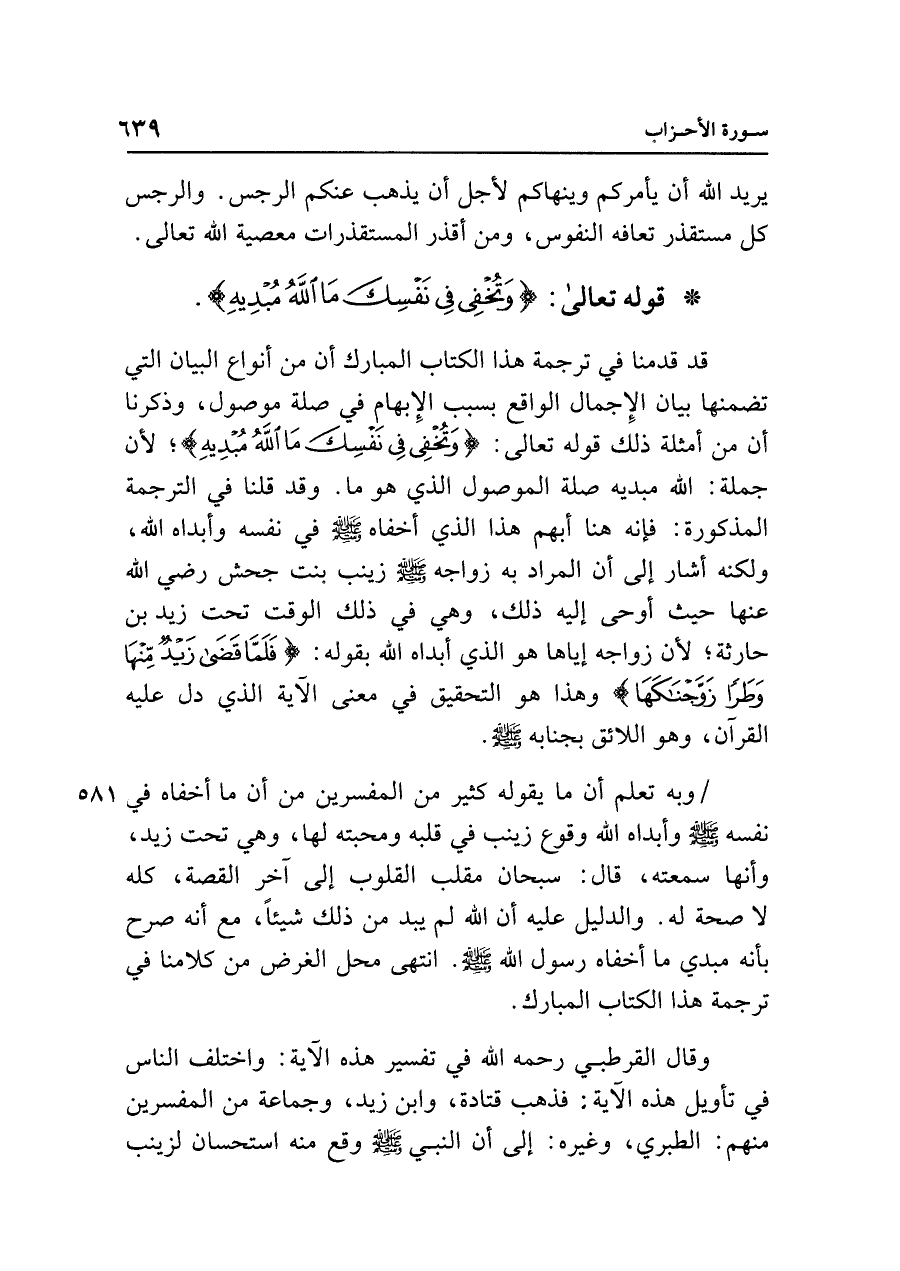 قد قدمنا في ترجمة هذا الكتاب المبارك أن من أنواع البيان التي تضمنها بيان الإِجمال الواقع بسبب الإِبهام في صلة موصول، وذكرنا أن من أمثلة ذلك قوله تعالى: {وَتُخْفِي فِي نَفْسِكَ مَا اللَّهُ مُبْدِيهِ}؛ لأن جملة: الله مبديه صلة الموصول الذي هو ما. وقد قلنا في الترجمة المذكورة: فإنه هنا أبهم هذا الذي أخفاه - صلى الله عليه وسلم - في نفسه وأبداه الله، ولكنه أشار إلى أن المراد به زواجه - صلى الله عليه وسلم - زينب بنت جحش رضي الله عنها حيث أوحى إليه ذلك، وهي في ذلك الوقت تحت زيد بن حارثة، لأن زواجه إياها هو الذي أبداه الله بقوله: {فَلَمَّا قَضَى زَيْدٌ مِنْهَا وَطَرًا زَوَّجْنَاكَهَا} وهذا هو التحقيق في معنى الآية الذي دل عليه القرآن، وهو اللائق بجنابه - صلى الله عليه وسلم -.