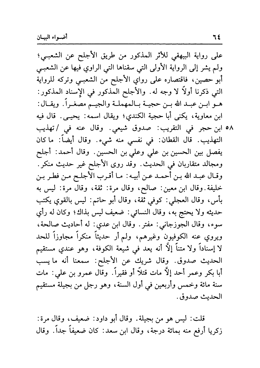 على رواية البيهقي للأثر المذكور من طريق الأجلح عن الشعبي؛ ولم يشر إلى الرواية الأولى التي سقناها التي الراوي فيها عن الشعبي أبو حصين، فاقتصاره على رواي الأجلح من الشعبي وتركه للرواية التي ذكرنا أولًا لا وجه له. والأجلح المذكور في الإِسناد المذكور: هو ابن عبد الله بن حجية بالمهملة والجيم مصغرًا. ويقال: ابن معاوية، يكنى أبا حجية الكندي، ويقال اسمه: يحيى. قال فيه ابن حجر في التقريب: صدوق شيعي. وقال عنه في تهذيب التهذيب. قال القطان: في نفسي منه شيء. وقال أيضًا: ما كان يفصل بين الحسين بن علي وعلي بن الحسين. وقال أحمد: أجلح ومجالد متقاربان في الحديث. وقد روى الأجلح غير حديث منكر. وقال عبد الله بن أحمد عن أبيه: ما أقرب الأجلح من فطر بن خليفة. وقال ابن معين: صالح، وقال مرة: ثقة، وقال مرة: ليس به بأس، وقال العجلي: كوفي ثقة، وقال أبو حاتم: ليس بالقوي يكتب حديثه ولا يحتج به، وقال النسائي: ضعيف ليس بذاك، وكان له رأي سوء، وقال الجوزجاني: مفتر. وقال ابن عدي: له أحاديث صالحة، ويروي عنه الكوفيون وغيرهم، ولم أر حديثًا منكرًا مجاوزًا للحد لا إسنادًا ولا متنًا إلَّا أنه يعد في شيعة الكوفة، وهو عندي مستقيم الحديث صدوق. وقال شريك عن الأجلح: سمعنا أنه ما يسب أبا بكر وعمر أحد إلَّا مات قتلًا أو فقيرًا. وقال عمرو بن علي: مات سنة مائة وخمس وأربعين في أول السنة، وهو رجل من بجيلة مستقيم الحديث صدوق.