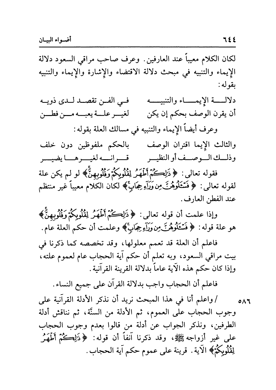 فاعلم أن العلة قد تعمم معلولها، وقد تخصصه كما ذكرنا في بيت مراقي السعود، وبه تعلم أن حكم آية الحجاب عام لعموم علته، وإذا كان حكم هذه الآية عامًا بدلالة القرينة القرآنية.