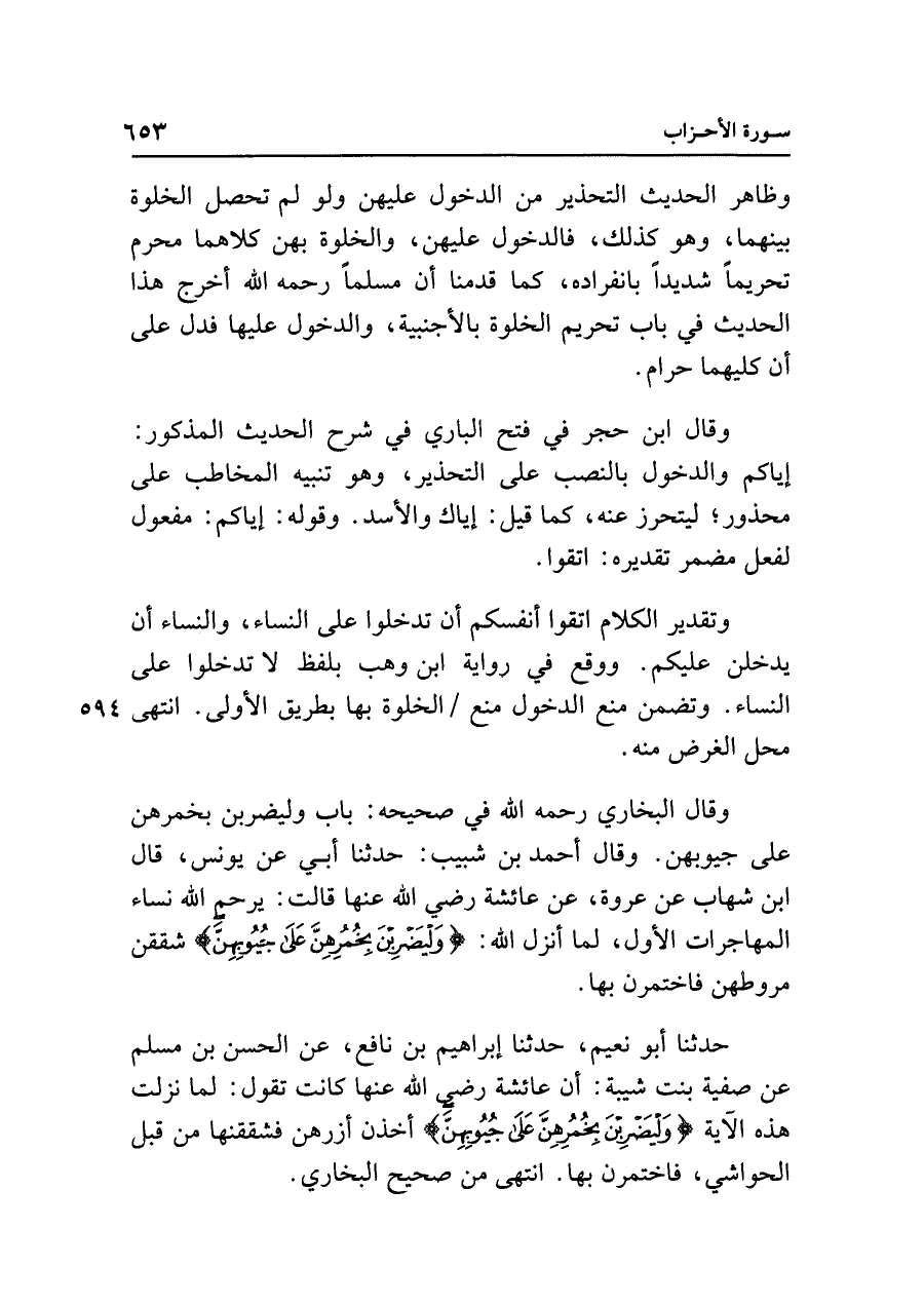 وقال البخاري رحمه الله في صحيحه: باب وليضربن بخمرهن على جيوبهن. وقال أحمد بن شبيب: حدثنا أبي عن يونس، قال ابن شهاب عن عروة، عن عائشة رضي الله عنها قالت: يرحم الله نساء المهاجرات الأول، لما أنزل الله: {وَلْيَضْرِبْنَ بِخُمُرِهِنَّ عَلَى جُيُوبِهِنَّ} شققن مروطهن فاختمرن بها.