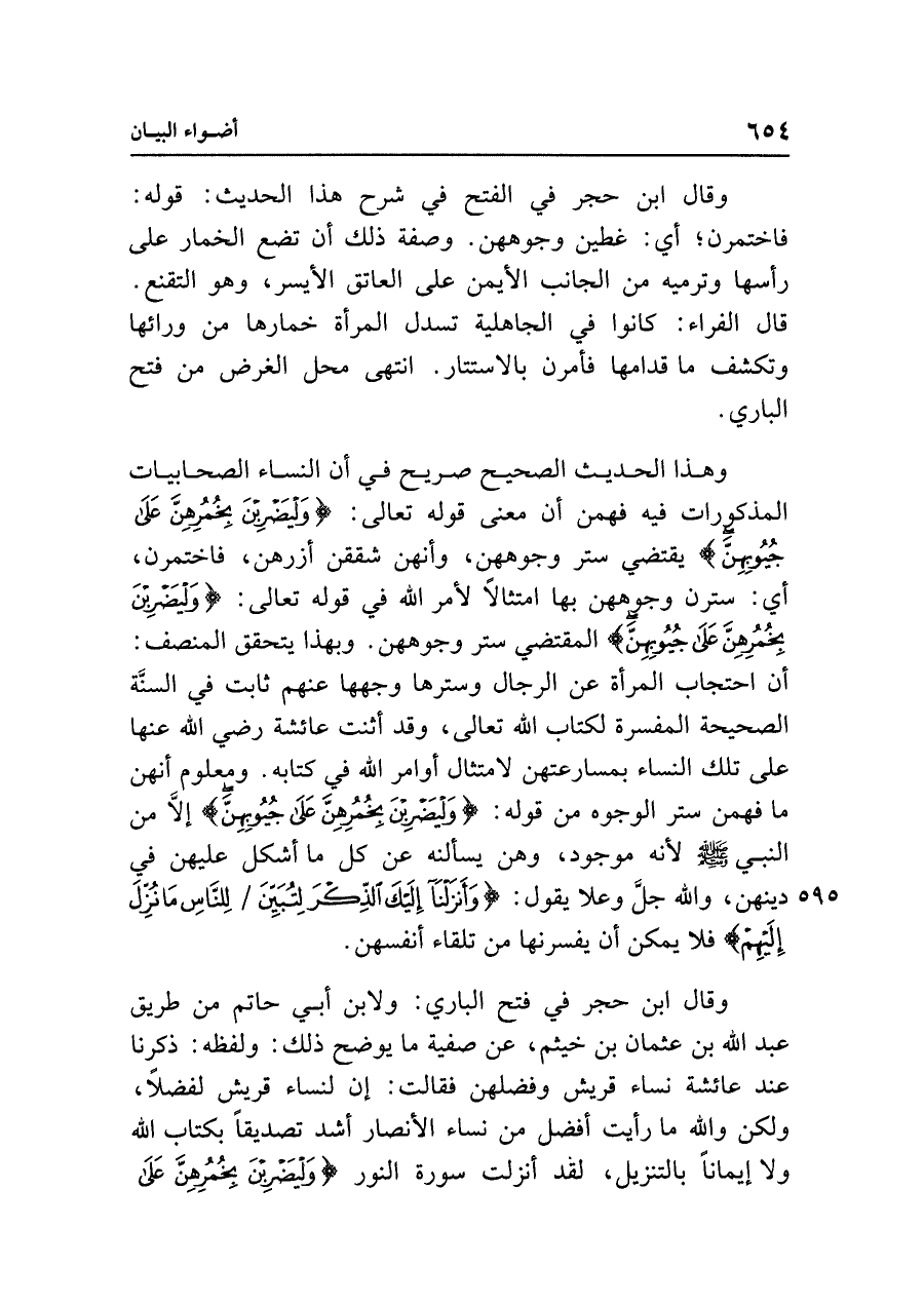 وهذا الحديث الصحيح صريح في أن النساء الصحابيات المذكورات فيه فهمن أن معنى قوله تعالى: {وَلْيَضْرِبْنَ بِخُمُرِهِنَّ عَلَى جُيُوبِهِنَّ} يقتضي ستر وجوههن، وأنهن شققن أزرهن، فاختمرن، أي: ستون وجوههن بها امتثالًا لأمر الله في قوله تعالى: {وَلْيَضْرِبْنَ بِخُمُرِهِنَّ عَلَى جُيُوبِهِنَّ} المقتضي ستر وجوههن. وبهذا يتحقق المنصف: أن احتجاب المرأة عن الرجال وسترها وجهها عنهم ثابت في السنة الصحيحة المفسرة لكتاب الله تعالى، وقد أثنت عائشة رضي الله عنها على تلك النساء بمسارعتهن لامتثال أوامر الله في كتابه. ومعلوم أنهن ما فهمن ستر الوجوه من قوله: {وَلْيَضْرِبْنَ بِخُمُرِهِنَّ عَلَى جُيُوبِهِنَّ} إلَّا من النبي - صلى الله عليه وسلم - لأنه موجود، وهن يسألنه عن كل ما أشكل عليهن في دينهن، واللَّه جل وعلا يقول: {وَأَنْزَلْنَا إِلَيْكَ الذِّكْرَ لِتُبَيِّنَ لِلنَّاسِ مَا نُزِّلَ إِلَيْهِمْ} فلا يمكن أن يفسرنها من تلقاء أنفسهن.