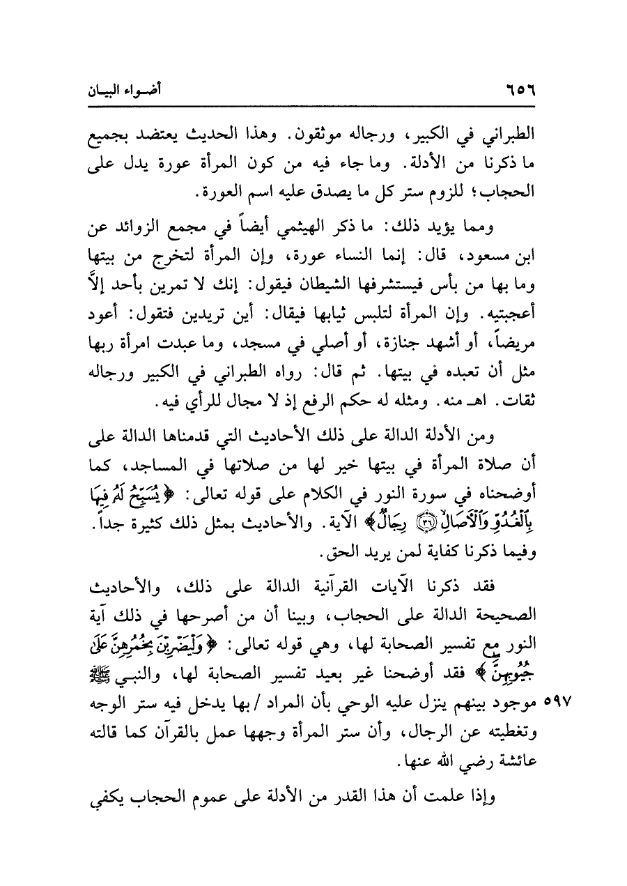 ومن الأدلة الدالة على ذلك الأحاديث التي قدمناها الدالة على أن صلاة المرأة في بيتها خير لها من صلاتها في المساجد، كما أوضحناه في سورة النور في الكلام على قوله تعالى: {يُسَبِّحُ لَهُ فِيهَا بِالْغُدُوِّ وَالْآصَالِ (٣٦) رِجَالٌ} الآية. والأحاديث بمثل ذلك كثيرة جدًّا. وفيما ذكرنا كفاية لمن يريد الحق.