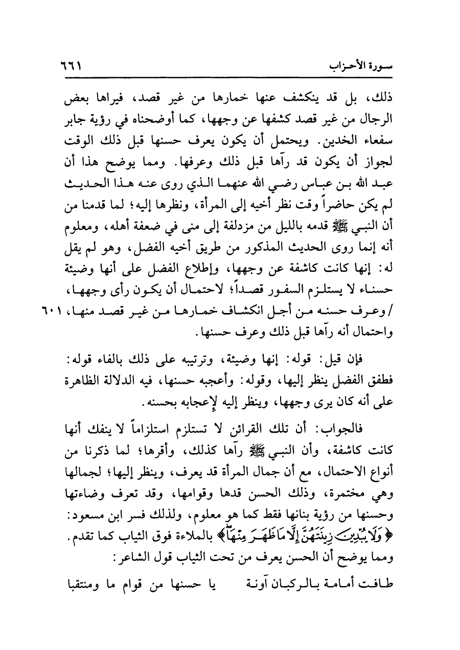 فالجواب: أن تلك القرائن لا تستلزم استلزامًا لا ينفك أنها كانت كاشفة، وأن النبي - صلى الله عليه وسلم - رآها كذلك، وأقرها، لما ذكرنا من أنواع الاحتمال، مع أن جمال المرأة قد يعرف، وينظر إليها؛ لجمالها وهي مختمرة، وذلك الحسن قدها وقوامها، وقد تعرف وضاءتها وحسنها من رؤية بنانها فقط كما هم معلوم، ولذلك فسر ابن مسعود: {وَلَا يُبْدِينَ زِينَتَهُنَّ إِلَّا مَا ظَهَرَ مِنْهَا} بالملاءة فوق الثياب كما تقدم. ومما يوضح أن الحسن يعرف من تحت الثياب قول الشاعر:
