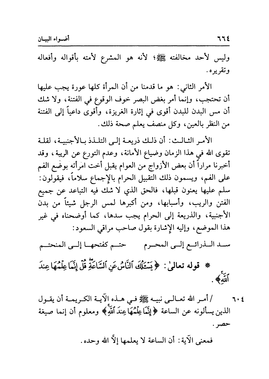 الأمر الثالث: أن ذلك ذريعة إلى التلذذ بالأجنبية، لقلة تقوى الله في هذا الزمان وضياع الأمانة، وعدم التورع عن الربية، وقد أخبرنا مرارًا أن بعض الأزواج من العوام يقبل أخت امرأته بوضع الفم على الفم، ويسمون ذلك التقبيل الحرام بالإِجماع سلامًا، فيقولون: سلم عليها يعنون قبلها، فالحق الذي لا شك فيه التباعد عن جميع الفتن والريب، وأسبابها، ومن أكبرها لمس الرجل شيئًا من بدن الأجنبية، والذريعة إلى الحرام يجب سدها، كما أوضحناه في غير هذا الموضع، وإليه الإِشارة يقول صاحب مراقي السعود: