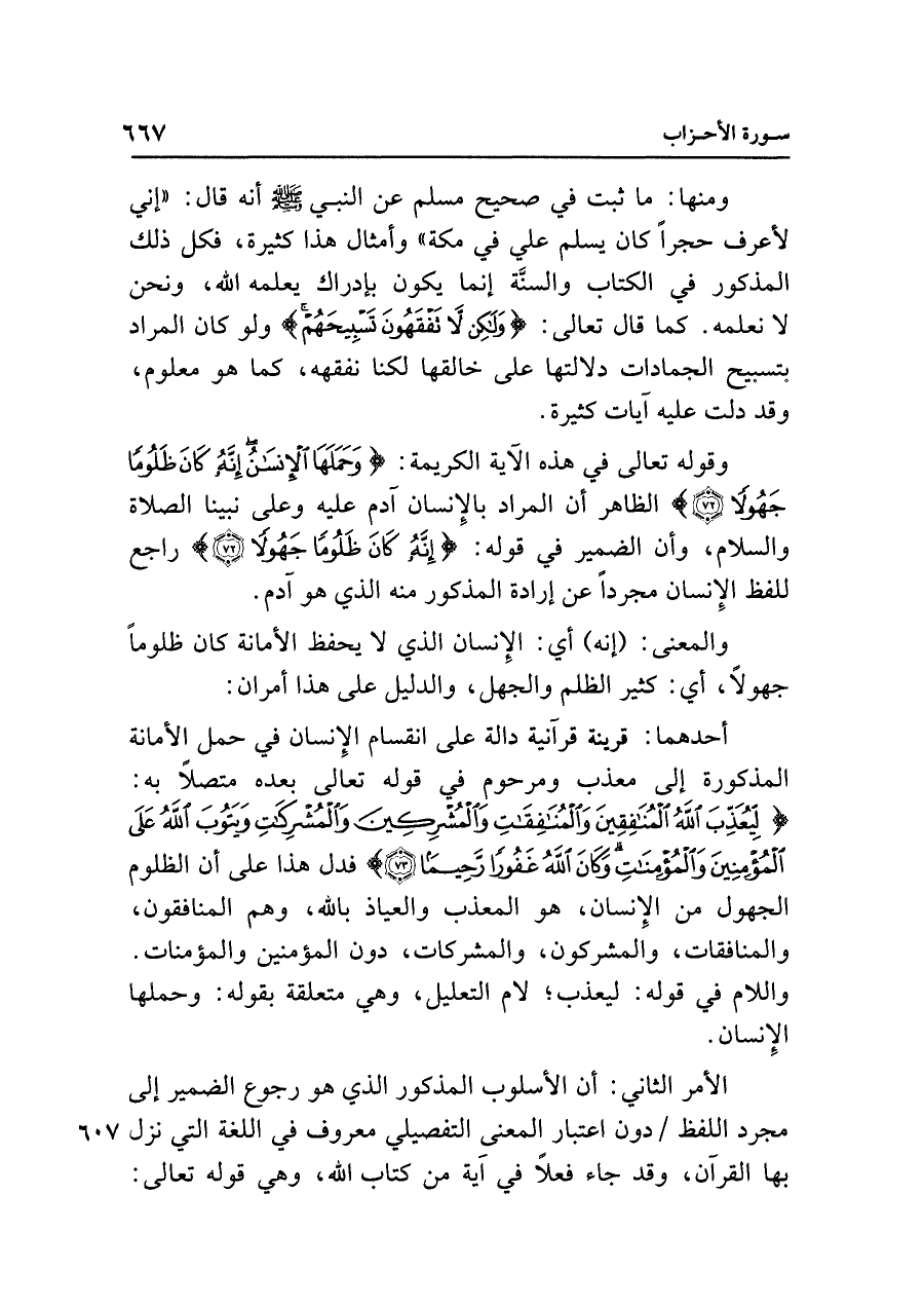 وقوله تعالى في هذه الآية الكريمة: {وَحَمَلَهَا الْإِنْسَانُ إِنَّهُ كَانَ ظَلُومًا جَهُولًا (٧٢)} الظاهر أن المراد بالإنسان آدم عليه وعلى نبينا الصلاة والسلام، وأن الضمير في قوله: {إِنَّهُ كَانَ ظَلُومًا جَهُولًا} راجع للفظ الإِنسان مجردًا عن إرادة المذكور منه الذي هو آدم.