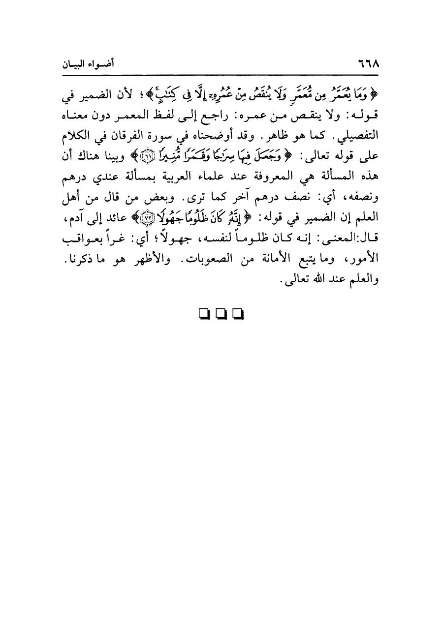 {وَمَا يُعَمَّرُ مِنْ مُعَمَّرٍ وَلَا يُنْقَصُ مِنْ عُمُرِهِ إِلَّا فِي كِتَابٍ}؛ لأن الضمير في قوله: ولا ينقص من عمره: راجع إلى لفظ المعمر دون معناه التفصيلي. كما هو ظاهر. وقد أوضحناه في سورة الفرقان في الكلام على قوله تعالى: {وَجَعَلَ فِيهَا سِرَاجًا وَقَمَرًا مُنِيرًا (٦١)} وبينا هناك أن هذه المسألة هي المعروفة عند علماء العربية بمسألة عندي درهم ونصفه، أي: نصف درهم آخر كما ترى. وبعض من قال من أهل العلم إن الضمير في قوله: {إِنَّهُ كَانَ ظَلُومًا جَهُولًا (٧٢)} عائد إلى آدم، قال: المعنى: إنه كان ظلومًا لنفسه، جهولًا؛ أي: غرًا بعواقب الأمور، وما يتبع الأمانة من الصعوبات. والأظهر هو ما ذكرنا. والعلم عند الله تعالى.