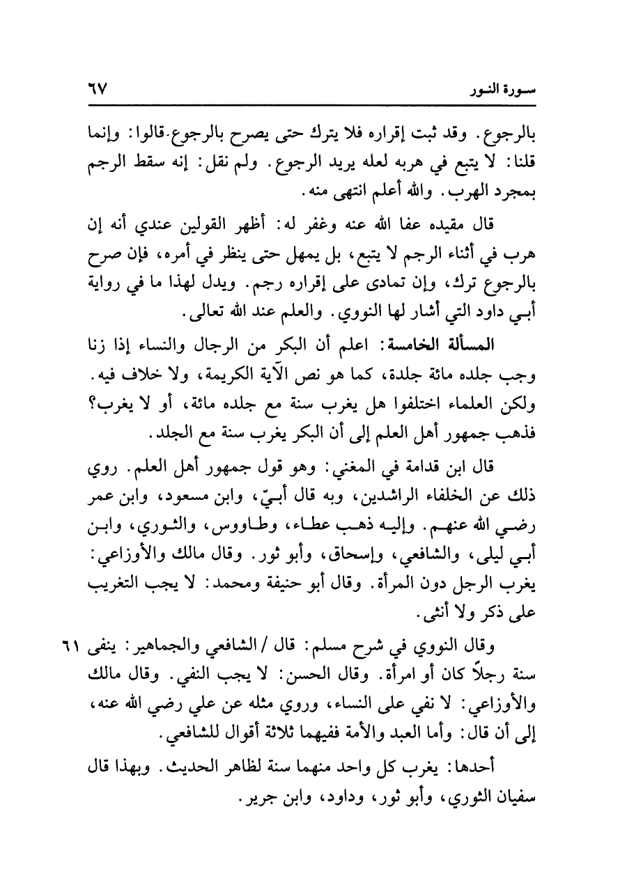 المسألة الخامسة: اعلم أن البكر من الرجال والنساء إذا زنا وجب جلده مائة جلدة، كما هو نص الآية الكريمة، ولا خلاف فيه. ولكن العلماء اختلفوا هل يغرب سنة مع جلده مائة، أو لا يغرب؟ فذهب جمهور أهل العلم إلى أن البكر يغرب سنة مع الجلد.