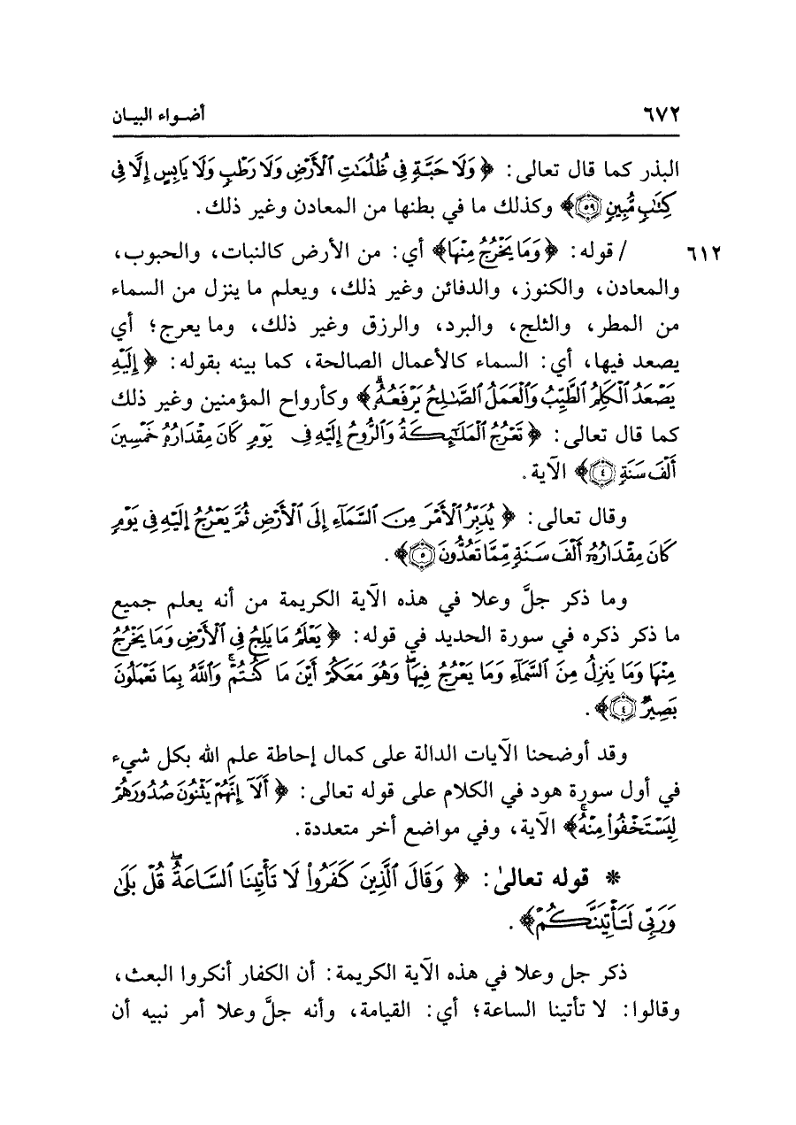 وما ذكر جلَّ وعلا في هذه الآية الكريمة من أنه يعلم جميع ما ذكر ذكره في سورة الحديد في قوله: {يَعْلَمُ مَا يَلِجُ فِي الْأَرْضِ وَمَا يَخْرُجُ مِنْهَا وَمَا يَنْزِلُ مِنَ السَّمَاءِ وَمَا يَعْرُجُ فِيهَا وَهُوَ مَعَكُمْ أَيْنَ مَا كُنْتُمْ وَاللَّهُ بِمَا تَعْمَلُونَ بَصِيرٌ (٤)}.