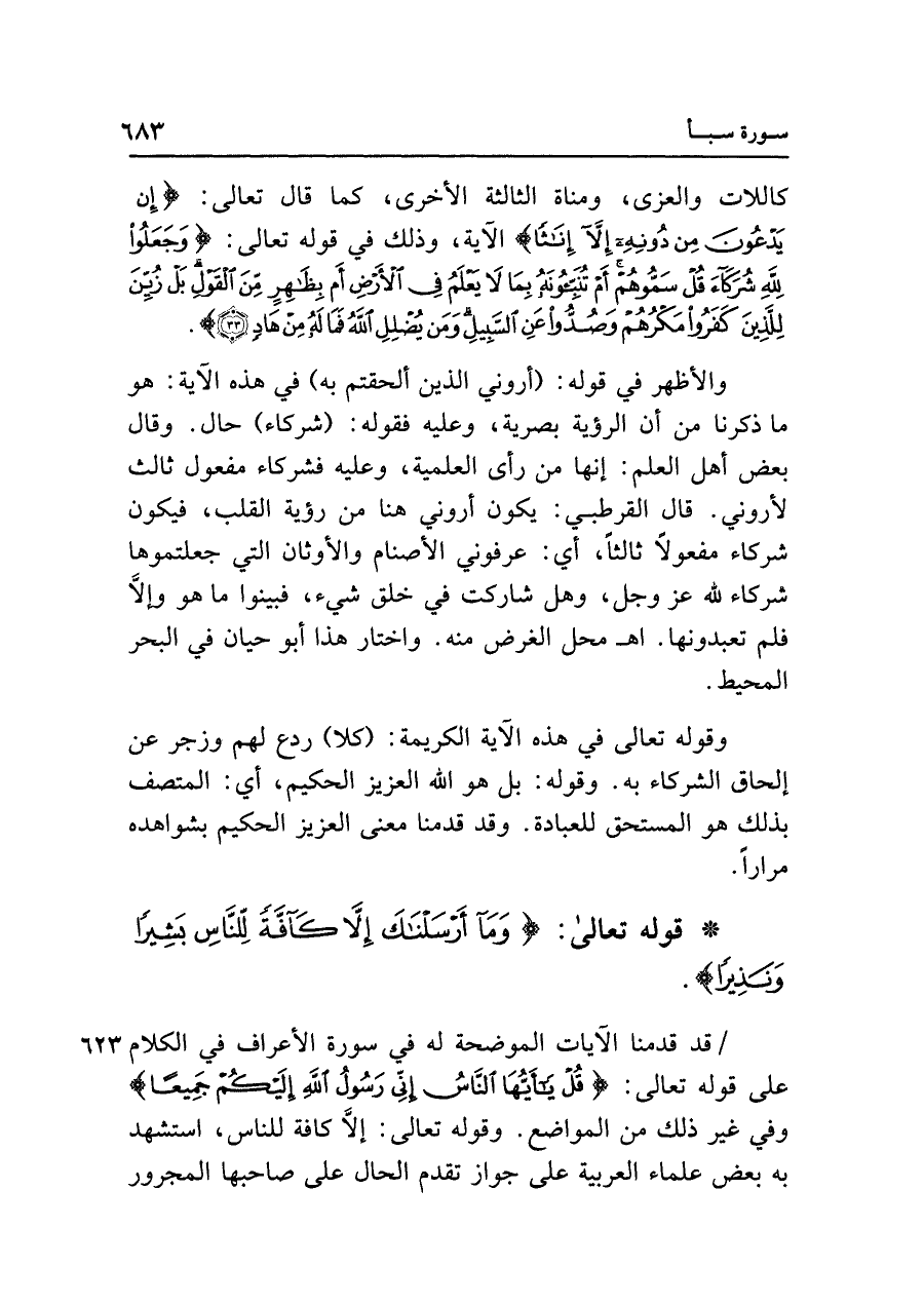 والأظهر في قوله: (أروني الذين ألحقتم به) في هذه الآية: هو ما ذكرنا من أن الرؤية بصرية، وعليه فقوله: (شركاء) حال. وقال بعض أهل العلم: إنها من رأى العلمية، وعليه فشركاء مفعول ثالث لأروني. قال القرطبي: يكون أروني هنا من رؤية القلب، فيكون شركاء مفعولًا ثالثًا، أي: عرفوني الأصنام والأوثان التي جعلتموها شركاء للَّه عز وجل، وهل شاركت في خلق شيء، فبينوا ما هو وإلَّا فلم تعبدونها. اهـ محل الغرض منه. واختار هذا أبو حيان في البحر المحيط.