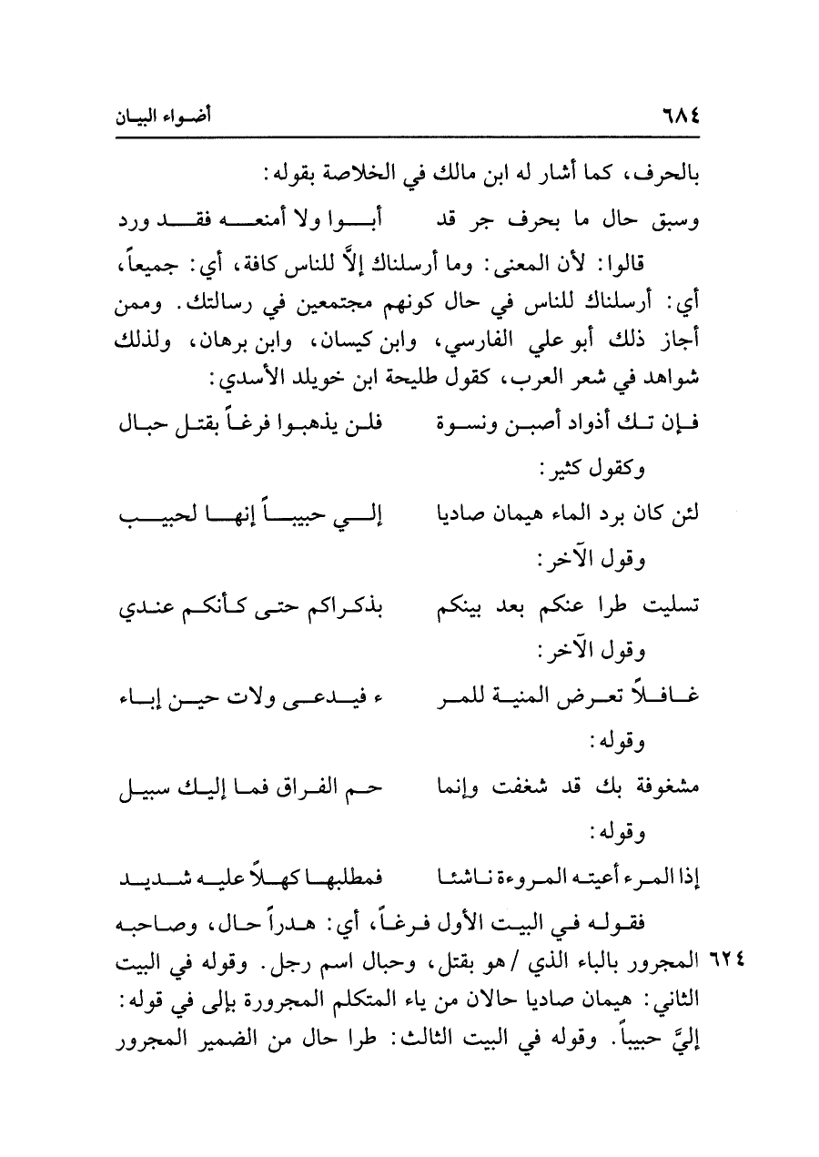 فقوله في البيت الأول فرغًا، أي: هدرًا حال، وصاحبه المجرور بالباء الذي هو بقتل، وحبال اسم رجل. وقوله في البيت الثاني: هيمان صاديا حالان من ياء المتكلم المجرورة بإلى في قوله: إليَّ حبيبًا. وقوله في البيت الثالث: طرا حال من الضمير المجرور