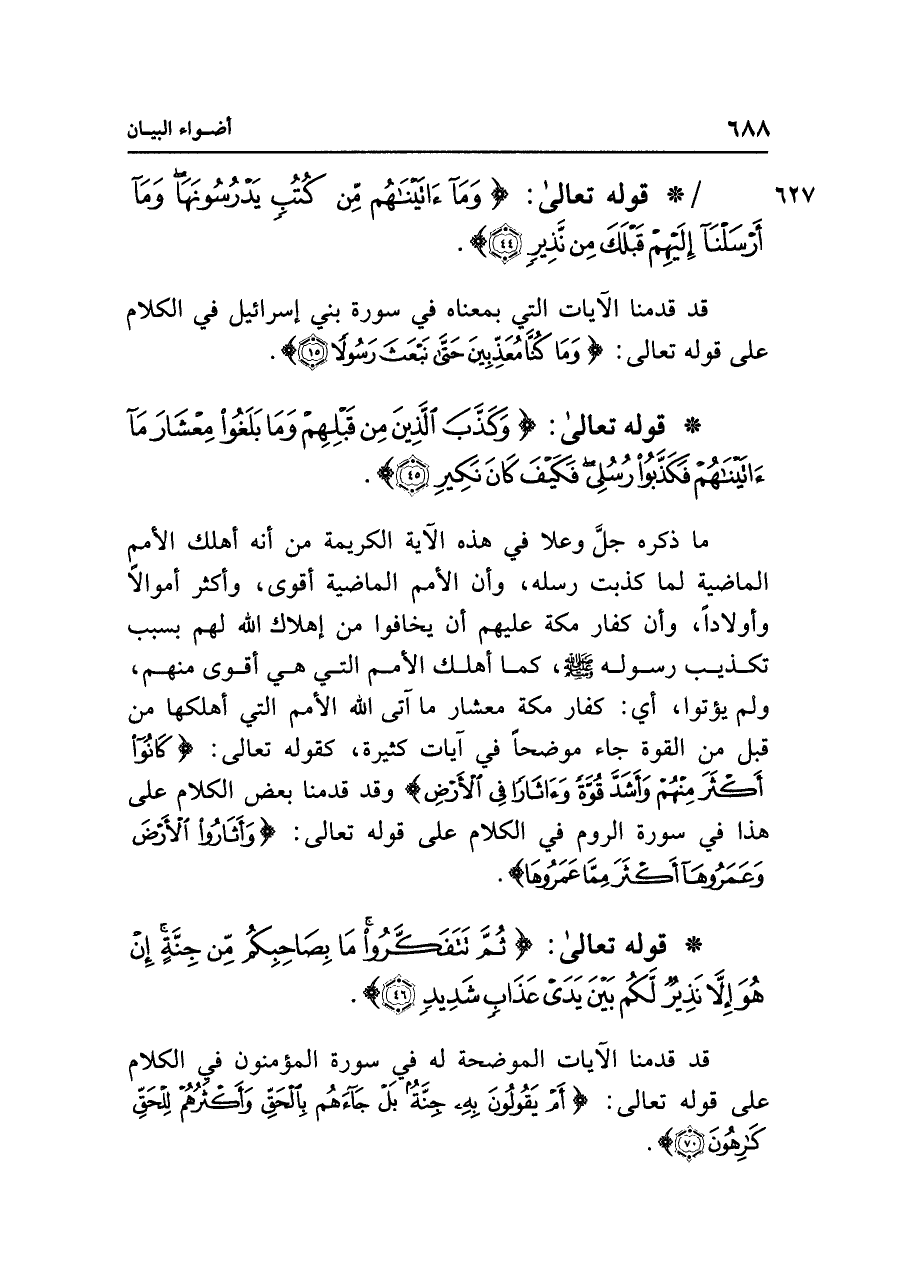 • قوله تعالى: {وَمَا آتَيْنَاهُمْ مِنْ كُتُبٍ يَدْرُسُونَهَا وَمَا أَرْسَلْنَا إِلَيْهِمْ قَبْلَكَ مِنْ نَذِيرٍ (٤٤)}.