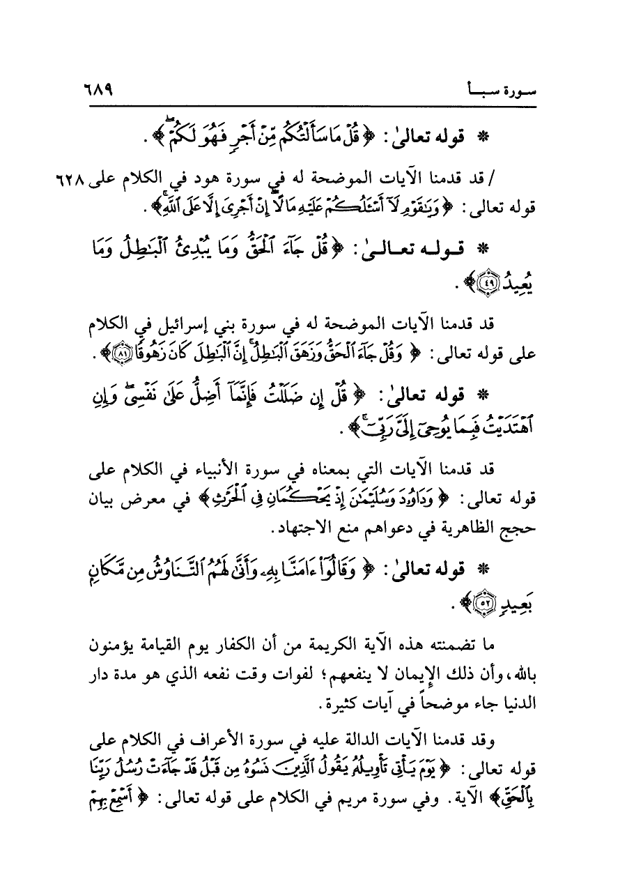 • قوله تعالى: {قُلْ جَاءَ الْحَقُّ وَمَا يُبْدِئُ الْبَاطِلُ وَمَا يُعِيدُ (٤٩)}.