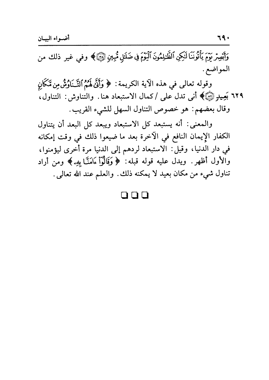 وقوله تعالى في هذه الآية الكريمة: {وَأَنَّى لَهُمُ التَّنَاوُشُ مِنْ مَكَانٍ بَعِيدٍ (٥٢)} أنى تدل على كمال الاستبعاد هنا. والتناوش: التناول، وقال بعضهم: هو خصوص التناول السهل للشيء القريب.