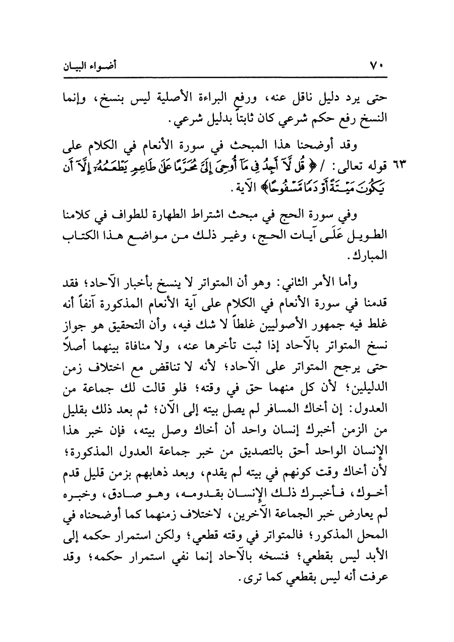 وأما الأمر الثاني: وهو أن المتواتر لا ينسخ بأخبار الآحاد، فقد قدمنا في سورة الأنعام في الكلام على آية الأنعام المذكورة آنفًا أنه غلط فيه جمهور الأصوليين غلطًا لا شك فيه، وأن التحقيق هو جواز نسخ المتواتر بالآحاد إذا ثبت تأخرها عنه، ولا منافاة بينهما أصلًا حتى يرجح المتواتر على الآحاد، لأنه لا تناقض مع اختلاف زمن الدليلين؛ لأن كل منهما حق في وقته؛ فلو قالت لك جماعة من العدول: إن أخاك المسافر لم يصل بيته إلى الآن، ثم بعد ذلك بقليل من الزمن أخبرك إنسان واحد أن أخاك وصل بيته، فإن خبر هذا الإنسان الواحد أحق بالتصديق من خبر جماعة العدول المذكورة؛ لأَن أخاك وقت كونهم في بيته لم يقدم، وبعد ذهابهم بزمن قليل قدم أخوك، فأخبرك ذلك الإِنسان بقدومه، وهو صادق، وخبره لم يعارض خبر الجماعة الآخرين، لاختلاف زمنهما كما أوضحناه في المحل المذكور؛ فالمتواتر في وقته قطعي، ولكن استمرار حكمه إلى الأبد ليس بقطعي؛ فنسخة بالآحاد إنما نفي استمرار حكمه؛ وقد عرفت أنه ليس بقطعي كما ترى.
