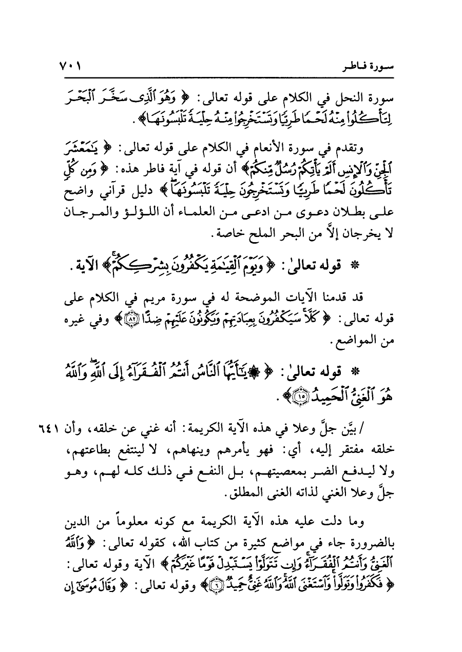 وما دلت عليه هذه الآية الكريمة مع كونه معلومًا من الدين بالضرورة جاء في مواضع كثيرة من كتاب الله، كقوله تعالى: {وَاللَّهُ الْغَنِيُّ وَأَنْتُمُ الْفُقَرَاءُ وَإِنْ تَتَوَلَّوْا يَسْتَبْدِلْ قَوْمًا غَيْرَكُمْ} الآية وقوله تعالى: {فَكَفَرُوا وَتَوَلَّوْا وَاسْتَغْنَى اللَّهُ وَاللَّهُ غَنِيٌّ حَمِيدٌ (٦)} وقوله تعالى: {وَقَالَ مُوسَى إِنْ