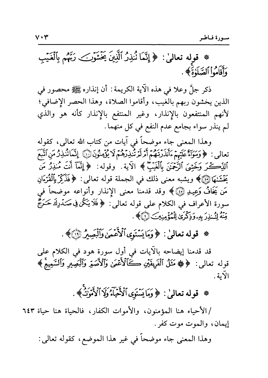 وهذا المعنى جاء موضحًا في آيات من كتاب الله تعالى، كقوله تعالى: {وَسَوَاءٌ عَلَيْهِمْ أَأَنْذَرْتَهُمْ أَمْ لَمْ تُنْذِرْهُمْ لَا يُؤْمِنُونَ (١٠) إِنَّمَا تُنْذِرُ مَنِ اتَّبَعَ الذِّكْرَ وَخَشِيَ الرَّحْمَنَ بِالْغَيْبِ} الآية. وقوله: {إِنَّمَا أَنْتَ مُنْذِرُ مَنْ يَخْشَاهَا (٤٥)} ويشبه معنى ذلك في الجملة قوله تعالى: {فَذَكِّرْ بِالْقُرْآنِ مَنْ يَخَافُ وَعِيدِ (٤٥)} وقد قدمنا معنى الإِنذار وأنواعه موضحًا في سورة الأعراف في الكلام على قوله تعالى: {فَلَا يَكُنْ فِي صَدْرِكَ حَرَجٌ مِنْهُ لِتُنْذِرَ بِهِ وَذِكْرَى لِلْمُؤْمِنِينَ (٢)}.