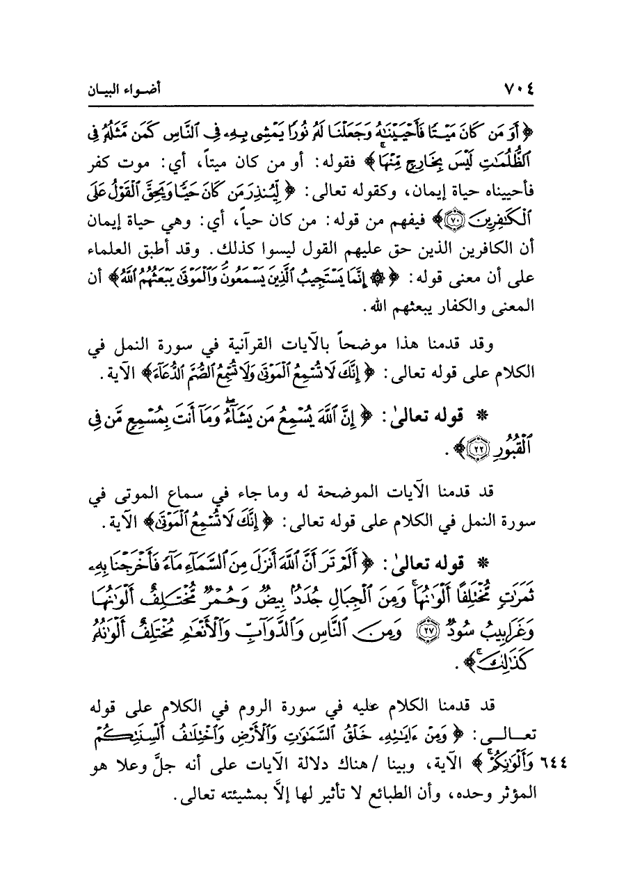 {أَوَمَنْ كَانَ مَيْتًا فَأَحْيَيْنَاهُ وَجَعَلْنَا لَهُ نُورًا يَمْشِي بِهِ فِي النَّاسِ كَمَنْ مَثَلُهُ فِي الظُّلُمَاتِ لَيْسَ بِخَارِجٍ مِنْهَا} فقوله: أو من كان ميتًا، أي: موت كفر فأحييناه حياة إيمان، وكقوله تعالى: {لِيُنْذِرَ مَنْ كَانَ حَيًّا وَيَحِقَّ الْقَوْلُ عَلَى الْكَافِرِينَ (٧٠)} فيفهم من قوله: من كان حيًا، أي: وهي حياة إيمان أن الكافرين الذين حق عليهم القول ليسوا كذلك. وقد أطبق العلماء على أن معنى قوله: {إِنَّمَا يَسْتَجِيبُ الَّذِينَ يَسْمَعُونَ وَالْمَوْتَى يَبْعَثُهُمُ اللَّهُ} أن المعنى والكفار يبعثهم الله.