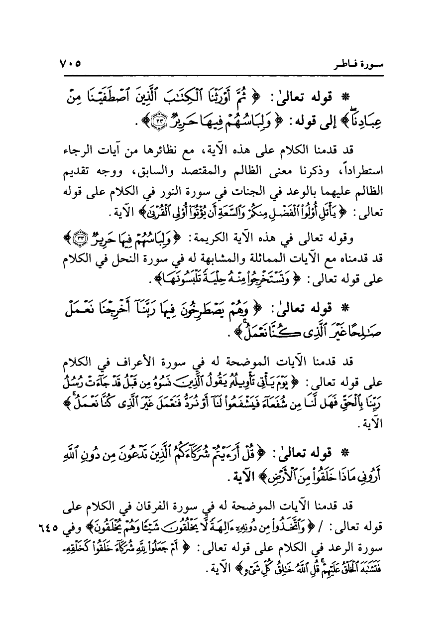 • قوله تعالى: {ثُمَّ أَوْرَثْنَا الْكِتَابَ الَّذِينَ اصْطَفَيْنَا مِنْ عِبَادِنَا} إلى قوله: {وَلِبَاسُهُمْ فِيهَا حَرِيرٌ (٢٣)}.
