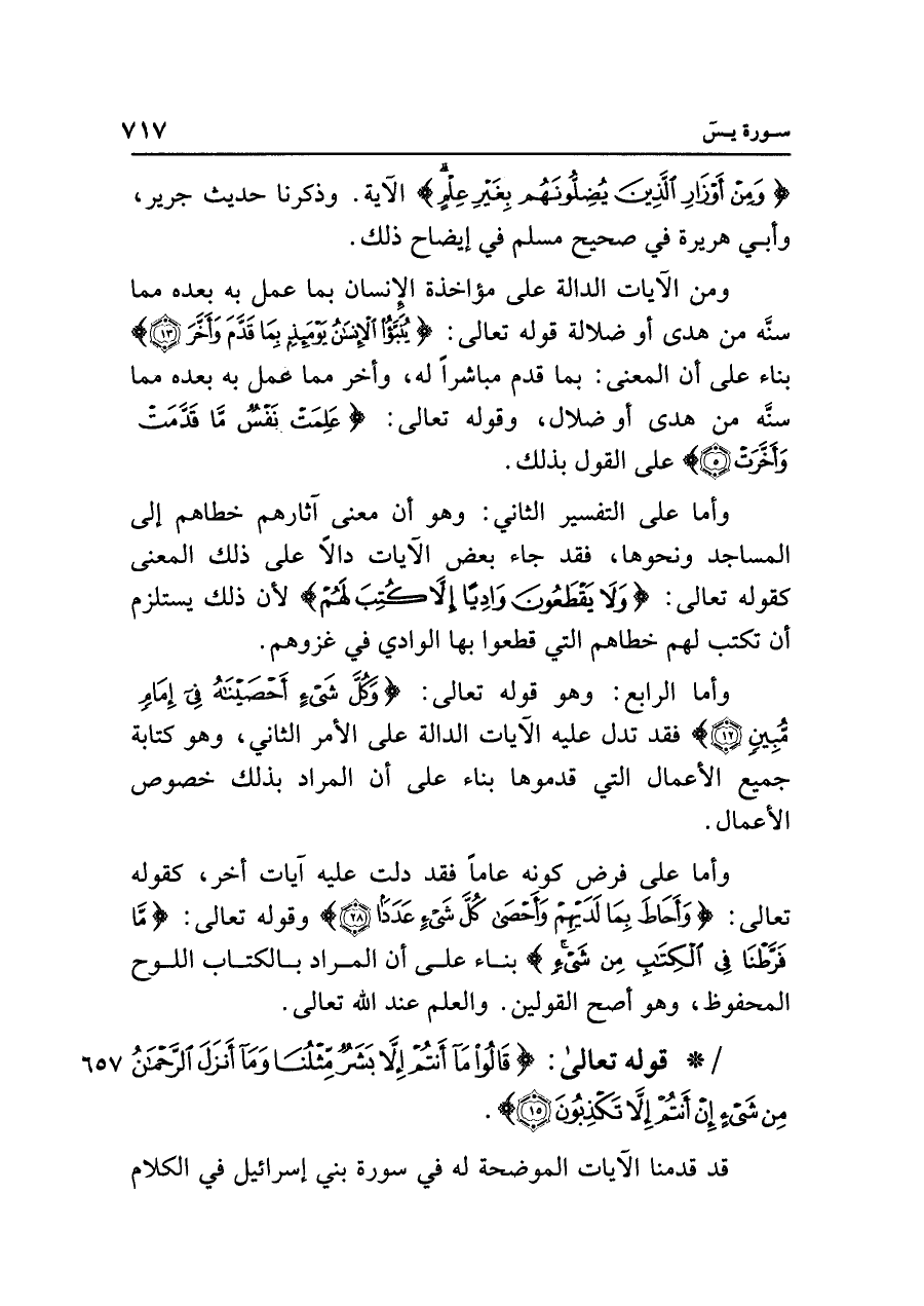 وأما على التفسير الثاني: وهو أن معنى آثارهم خطاهم إلى المساجد ونحوها، فقد جاء بعض الآيات دالًا على ذلك المعنى كقوله تعالى: {وَلَا يَقْطَعُونَ وَادِيًا إِلَّا كُتِبَ لَهُمْ} لأن ذلك يستلزم أن تكتب لهم خطاهم التي قطعوا بها الوادي في غزوهم.