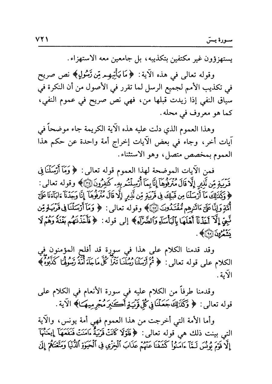 فمن الآيات الموضحة لهذا العموم قوله تعالى: {وَمَا أَرْسَلْنَا فِي قَرْيَةٍ مِنْ نَذِيرٍ إِلَّا قَالَ مُتْرَفُوهَا إِنَّا بِمَا أُرْسِلْتُمْ بِهِ كَافِرُونَ (٣٤)} وقوله تعالى: {وَكَذَلِكَ مَا أَرْسَلْنَا مِنْ قَبْلِكَ فِي قَرْيَةٍ مِنْ نَذِيرٍ إِلَّا قَالَ مُتْرَفُوهَا إِنَّا وَجَدْنَا آبَاءَنَا عَلَى أُمَّةٍ وَإِنَّا عَلَى آثَارِهِمْ مُقْتَدُونَ (٢٣)} وقوله تعالى: {وَمَا أَرْسَلْنَا فِي قَرْيَةٍ مِنْ نَبِيٍّ إِلَّا أَخَذْنَا أَهْلَهَا بِالْبَأْسَاءِ وَالضَّرَّاءِ} إلى قوله: {فَأَخَذْنَاهُمْ بَغْتَةً وَهُمْ لَا يَشْعُرُونَ (٩٥)}.