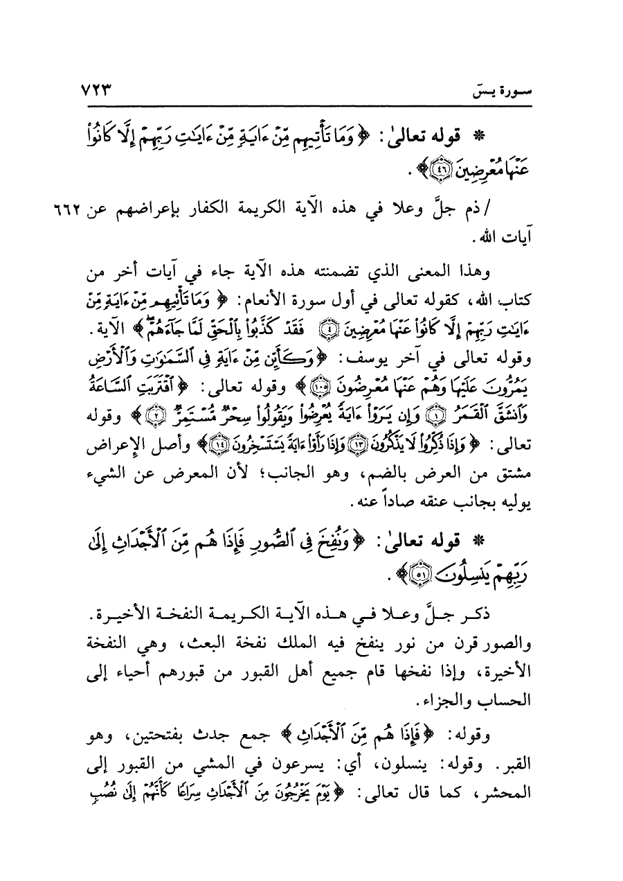 وهذا المعنى الذي تضمنته هذه الآية جاء في آيات أخر من كتاب الله، كقوله تعالى في أول سورة الأنعام: {وَمَا تَأْتِيهِمْ مِنْ آيَةٍ مِنْ آيَاتِ رَبِّهِمْ إِلَّا كَانُوا عَنْهَا مُعْرِضِينَ (٤) فَقَدْ كَذَّبُوا بِالْحَقِّ لَمَّا جَاءَهُمْ} الآية. وقوله تعالى في آخر يوسف: {وَكَأَيِّنْ مِنْ آيَةٍ فِي السَّمَاوَاتِ وَالْأَرْضِ يَمُرُّونَ عَلَيْهَا وَهُمْ عَنْهَا مُعْرِضُونَ (١٠٥)} وقوله تعالى: {اقْتَرَبَتِ السَّاعَةُ وَانْشَقَّ الْقَمَرُ (١) وَإِنْ يَرَوْا آيَةً يُعْرِضُوا وَيَقُولُوا سِحْرٌ مُسْتَمِرٌّ (٢)} وقوله تعالى: {وَإِذَا ذُكِّرُوا لَا يَذْكُرُونَ (١٣) وَإِذَا رَأَوْا آيَةً يَسْتَسْخِرُونَ (١٤)} وأصل الإِعراض مشتق من العرض بالضم، وهو الجانب؛ لأن المعرض عن الشيء يوليه بجانب عنقه صادًا عنه.