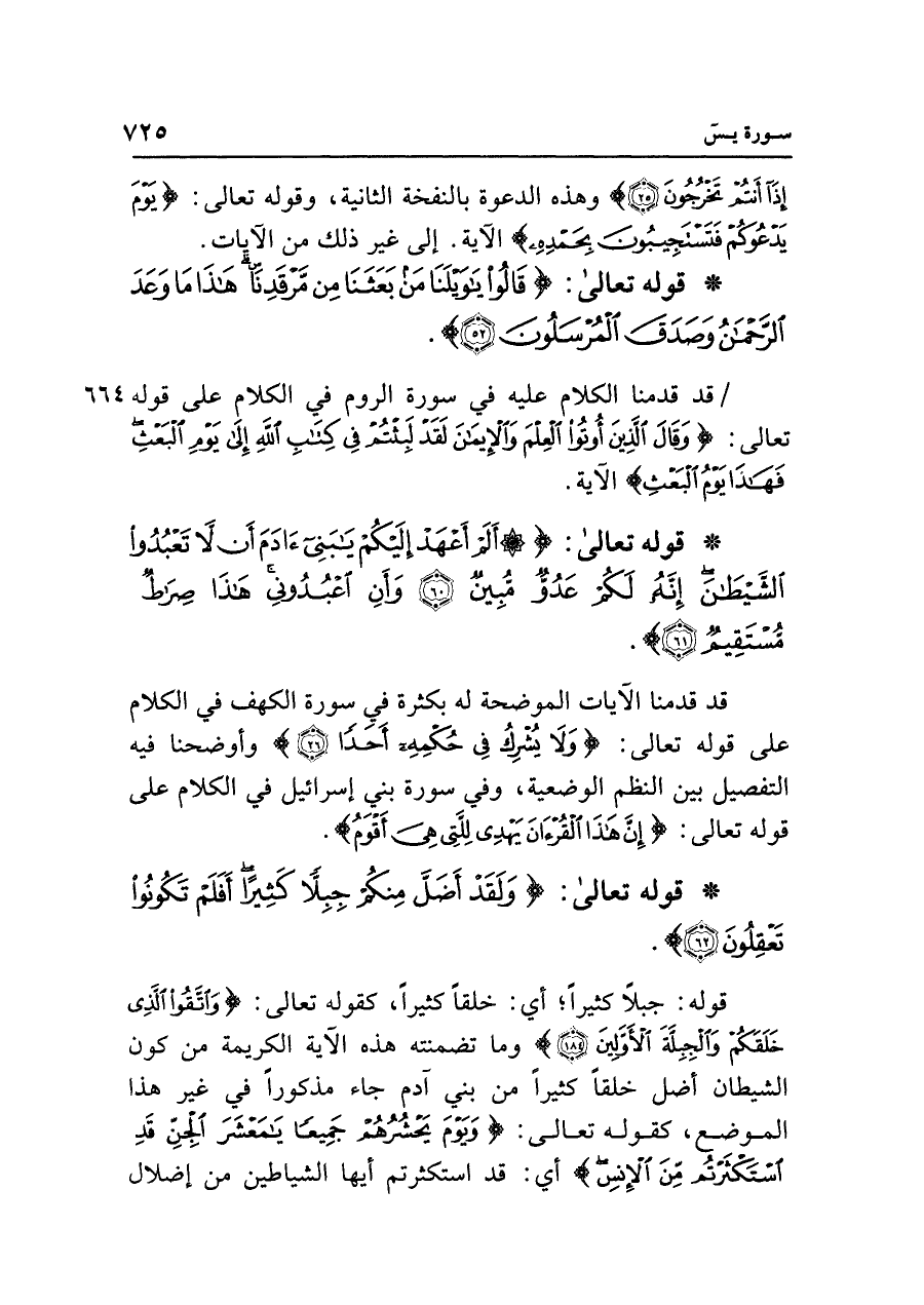 قوله: جبلًا كثيرًا؛ أي: خلقًا كثيرًا، كقوله تعالى: {وَاتَّقُوا الَّذِي خَلَقَكُمْ وَالْجِبِلَّةَ الْأَوَّلِينَ (١٨٤)} وما تضمنته هذه الآية الكريمة من كون الشيطان أضل خلقًا كثيرًا من بني آدم جاء مذكورًا في غير هذا الموضع، كقوله تعالى: {وَيَوْمَ يَحْشُرُهُمْ جَمِيعًا يَامَعْشَرَ الْجِنِّ قَدِ اسْتَكْثَرْتُمْ مِنَ الْإِنْسِ} أي: قد استكثرتم أيها الشياطين من إضلال