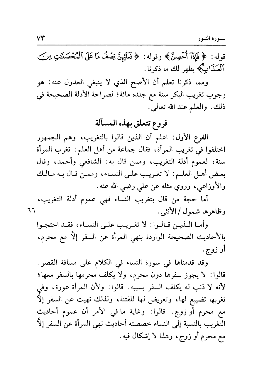وقد قدمناها في سورة النساء في الكلام على مسافة القصر. قالوا: لا يجوز سفرها دون محرم، ولا يكلف محرمها بالسفر معها؛ لأنه لا ذنب له يكلف السفر بسببه. قالوا: ولأن المرأة عورة، وفي تغربها تضييع لها، وتعريض لها للفتنة، ولذلك نهيت عن السفر إلَّا مع محرم أو زوج. قالوا: وغاية ما في الأمر أن عموم أحاديث التغريب بالنسبة إلى النساء خصصته أحاديث نهي المرأة عن السفر إلَّا مع محرم أو زوج، وهذا لا إشكال فيه.