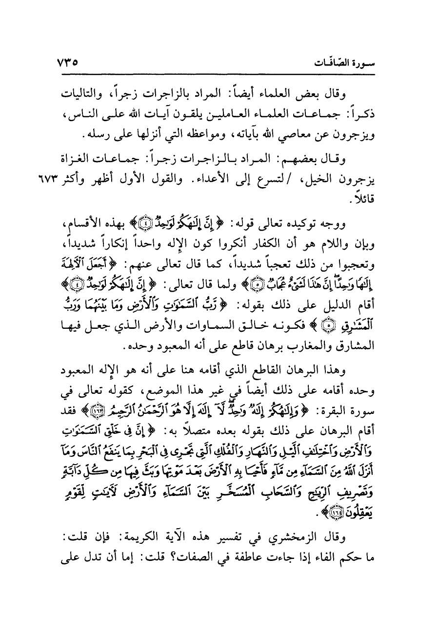 ووجه توكيده تعالى قوله: {إِنَّ إِلَهَكُمْ لَوَاحِدٌ (٤)} بهذه الأقسام، وبإن واللام هو أن الكفار أنكروا كون الإله واحدًا إنكارًا شديدًا، وتعجبوا من ذلك تعجبًا شديدًا، كما قال تعالى عنهم: {أَجَعَلَ الْآلِهَةَ إِلَهًا وَاحِدًا إِنَّ هَذَا لَشَيْءٌ عُجَابٌ (٥)} ولما قال تعالى: {إِنَّ إِلَهَكُمْ لَوَاحِدٌ (٤)} أقام الدليل على ذلك بقوله: {رَبُّ السَّمَاوَاتِ وَالْأَرْضِ وَمَا بَيْنَهُمَا وَرَبُّ الْمَشَارِقِ (٥)} فكونه خالق السماوات والأرض الذي جعل فيها المشارق والمغارب برهان قاطع على أنه المعبود وحده.