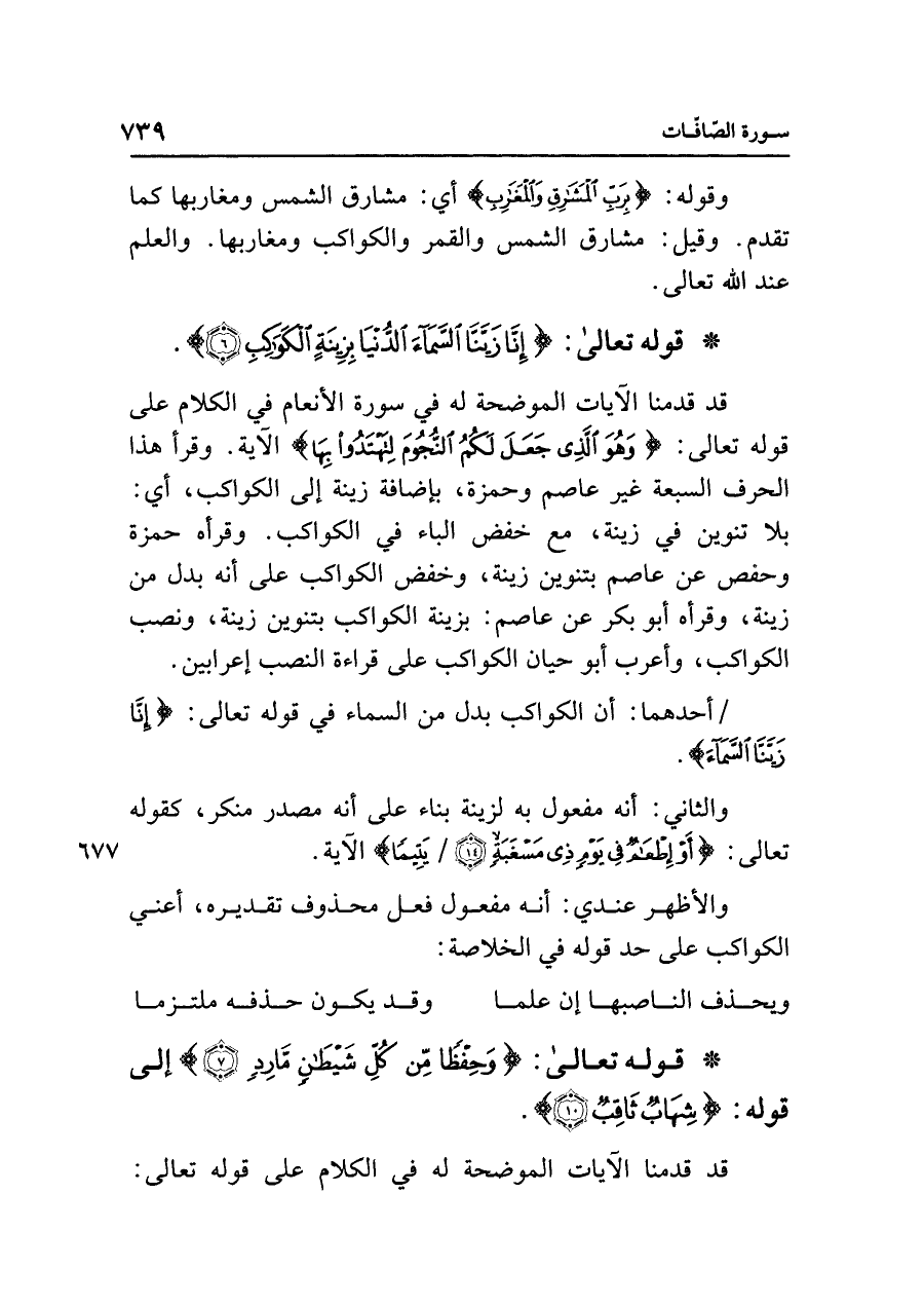 قد قدمنا الآيات الموضحة له في سورة الأنعام في الكلام على قوله تعالى: {وَهُوَ الَّذِي جَعَلَ لَكُمُ النُّجُومَ لِتَهْتَدُوا بِهَا} الآية. وقرأ هذا الحرف السبعة غير عاصم وحمزة، بإضافة زينة إلى الكواكب، أي: بلا تنوين في زينة، مع خفض الباء في الكواكب. وقرأه حمزة وحفص عن عاصم بتنوين زينة، وخفض الكواكب على أنه بدل من زينة، وقرأه أبو بكر عن عاصم: بزينة الكواكب بتنوين زينة، ونصب الكواكب، وأعرب أبو حيان الكواكب على قراءة النصب إعرابين.
