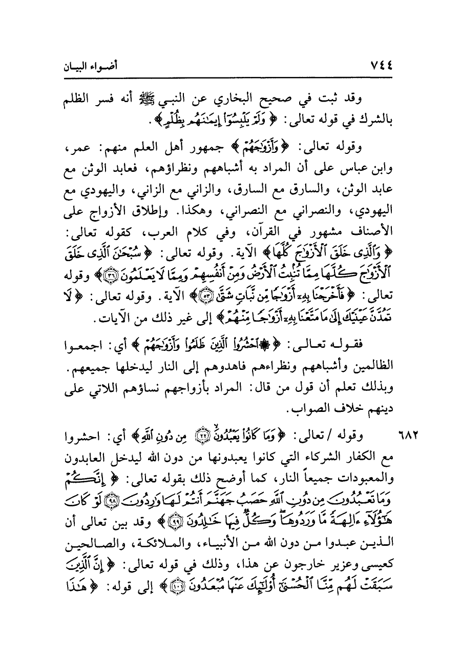 وقوله تعالى: {وَأَزْوَاجُهُمْ} جمهور أهل العلم منهم: عمر، وابن عباس على أن المراد به أشباههم ونظراؤهم، فعابد الوثن مع عابد الوثن، والسارق مع السارق، والزاني مع الزاني، واليهودي مع اليهودي، والنصراني مع النصراني، وهكذا. وإطلاق الأزواج على الأصناف مشهور في القرآن، وفي كلام العرب، كقوله تعالى: {وَالَّذِي خَلَقَ الْأَزْوَاجَ كُلَّهَا} الآية. وقوله تعالى: {سُبْحَانَ الَّذِي خَلَقَ الْأَزْوَاجَ كُلَّهَا مِمَّا تُنْبِتُ الْأَرْضُ وَمِنْ أَنْفُسِهِمْ وَمِمَّا لَا يَعْلَمُونَ (٣٦)} وقوله تعالى: {فَأَخْرَجْنَا بِهِ أَزْوَاجًا مِنْ نَبَاتٍ شَتَّى (٥٣)} الآية. وقوله تعالى: {لَا تَمُدَّنَّ عَيْنَيْكَ إِلَى مَا مَتَّعْنَا بِهِ أَزْوَاجًا مِنْهُمْ} إلى غير ذلك من الآيات.