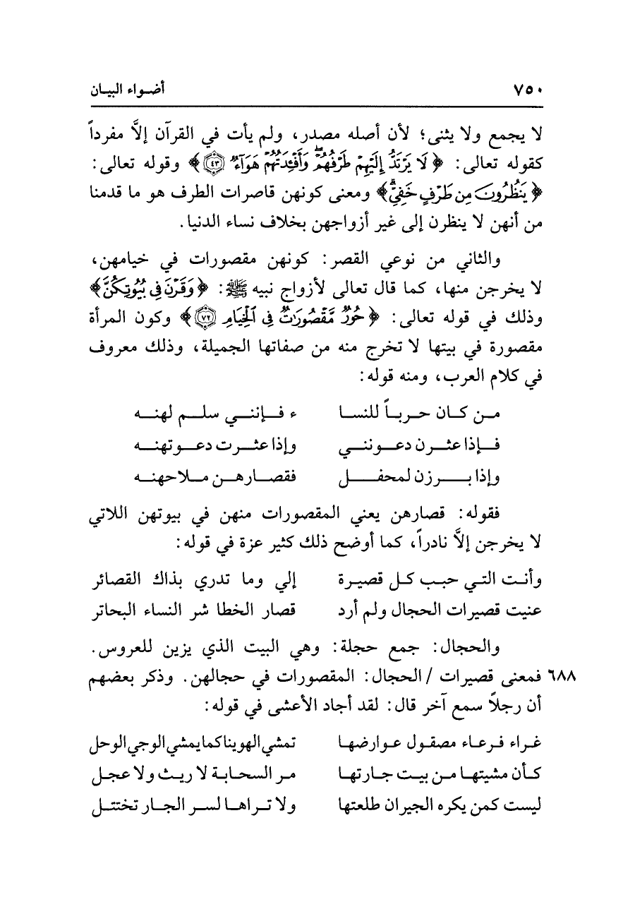 والثاني من نوعي القصر: كونهن مقصورات في خيامهن، لا يخرجن منها، كما قال تعالى لأزواج نبيه - صلى الله عليه وسلم -: {وَقَرْنَ فِي بُيُوتِكُنَّ} وذلك في قوله تعالى: {حُورٌ مَقْصُورَاتٌ فِي الْخِيَامِ (٧٢)} وكون المرأة مقصورة في بيتها لا تخرج منه من صفاتها الجميلة، وذلك معروف في كلام العرب، ومنه قوله: