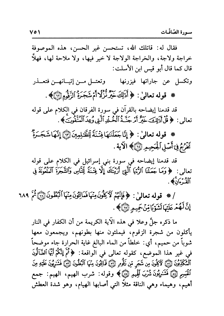 قد قدمنا إيضاحه في سورة بني إسرائيل في الكلام على قوله تعالى: {وَمَا جَعَلْنَا الرُّؤْيَا الَّتِي أَرَيْنَاكَ إِلَّا فِتْنَةً لِلنَّاسِ وَالشَّجَرَةَ الْمَلْعُونَةَ فِي الْقُرْآنِ}.