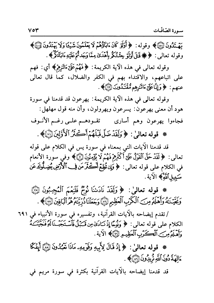 تقدم إيضاحه بالآيات القرآنية، وتفسيره في سورة الأنبياء في الكلام على قوله تعالى: {وَنُوحًا إِذْ نَادَى مِنْ قَبْلُ فَاسْتَجَبْنَا لَهُ فَنَجَّيْنَاهُ وَأَهْلَهُ مِنَ الْكَرْبِ الْعَظِيمِ (٧٦)} الآية.