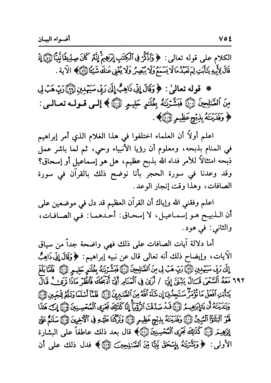 اعلم أولًا أن العلماء اختلفوا في هذا الغلام الذي أمر إبراهيم في المنام بذبحه، ومعلوم أن رؤيا الأنبياء وحي، ثم لما باشر عمل ذبحه امتثالًا للأمر فداه الله بذبح عظيم، هل هو إسماعيل أو إسحاق؟ وقد وعدنا في سورة الحجر بأنا نوضح ذلك بالقرآن في سورة الصافات، وهذا وقت إنجار الوعد.