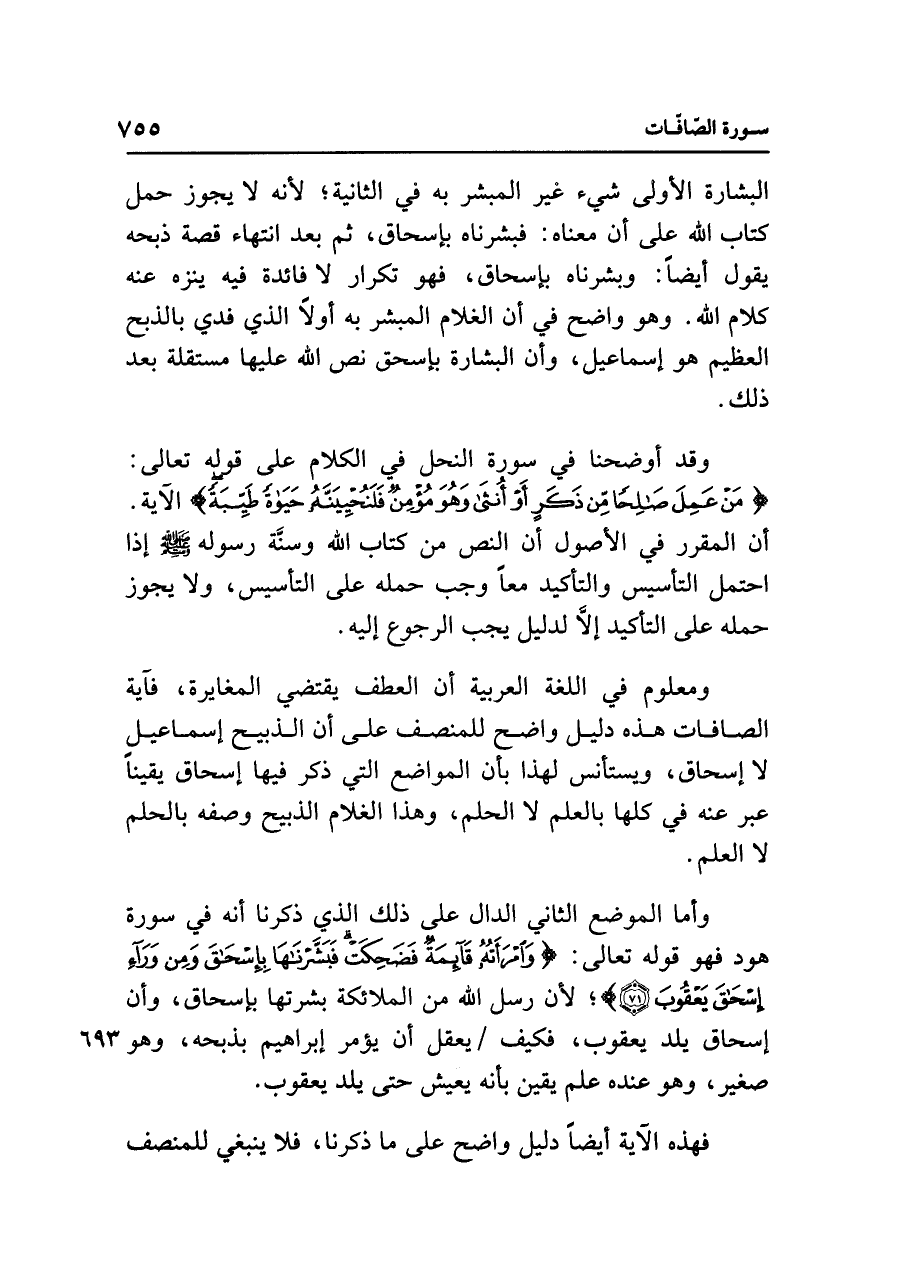 البشارة الأولى شيء غير المبشر به في الثانية؛ لأنه لا يجوز حمل كتاب الله على أن معناه: فبشرناه بإسحاق، ثم بعد انتهاء قصة ذبحه يقول أيضًا: وبشرناه بإسحاق، فهو تكرار لا فائدة فيه ينزه عنه كلام الله. وهو واضح في أن الغلام المبشر به أولًا الذي فدي بالذبح العظيم هو إسماعيل، وأن البشارة بإسحق نص الله عليها مستقلة بعد ذلك.