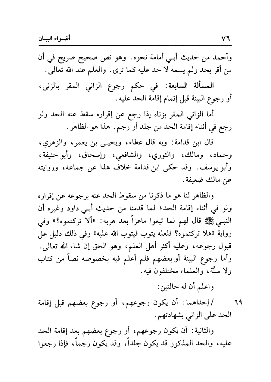 والظاهر لنا هو ما ذكرنا من سقوط الحد عنه برجوعه عن إقراره ولو في أثناء إقامة الحد، لما قدمنا من حديث أبي داود وغيره أن النبي - صلى الله عليه وسلم - قال لهم لما تبعوا ماعزًا بعد هربه: "ألا تركتموه؟ " وفي رواية "هلا تركتموه؟ فلعله يتوب فيتوب الله عليه" وفي ذلك دليل على قبول رجوعه، وعليه أكثر أهل العلم، وهو الحق إن شاء الله تعالى. وأما رجوع البينة أو بعضهم فلم أعلم فيه بخصوصه نصًا من كتاب ولا سنَّة، والعلماء مختلفون فيه.