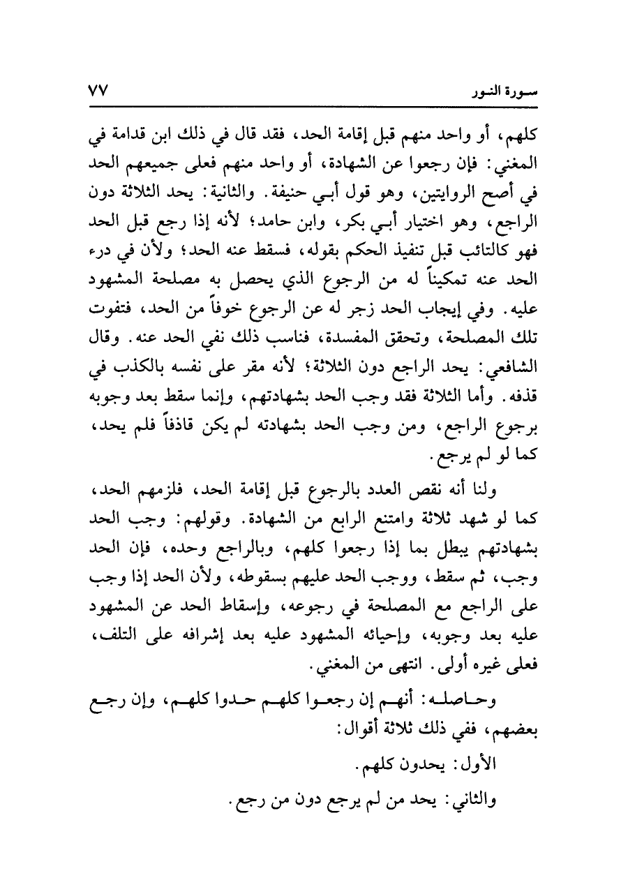 وحاصله: أنهم إن رجعوا كلهم حدوا كلهم، وإن رجع بعضهم، ففي ذلك ثلاثة أقوال: