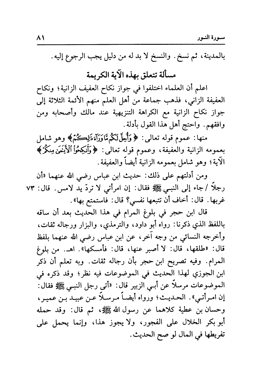 اعلم أن العلماء اختلفوا في جواز نكاح العفيف الزانية؛ ونكاح العفيفة الزاني، فذهب جماعة من أهل العلم منهم الأئمة الثلاثة إلى جواز نكاح الزانية مع الكراهة التنزيهية عند مالك وأصحابه ومن وافقهم. واحتج أهل هذا القول بأدلة.