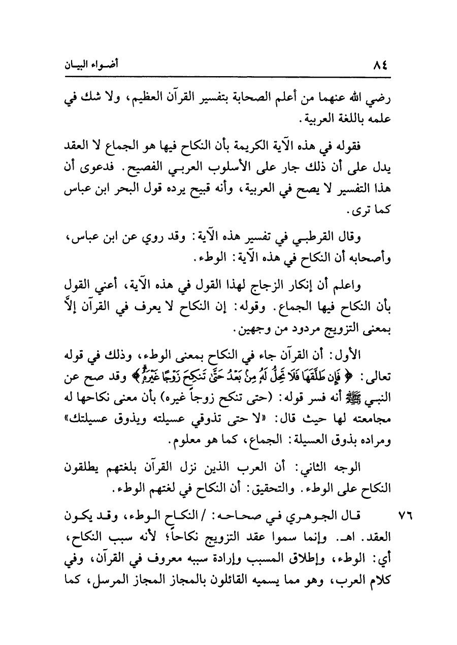 فقوله في هذه الآية الكريمة بأن النكاح فيها هو الجماع لا العقد يدل على أن ذلك جار على الأسلوب العربي الفصيح. فدعوى أن هذا التفسير لا يصح في العربية، وأنه قبيح يرده قول البحر ابن عباس كما ترى.