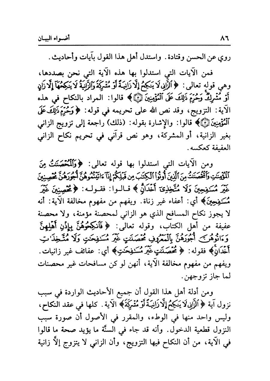 ومن الآيات التي استدلوا بها قوله تعالى: {وَالْمُحْصَنَاتُ مِنَ الْمُؤْمِنَاتِ وَالْمُحْصَنَاتُ مِنَ الَّذِينَ أُوتُوا الْكِتَابَ مِنْ قَبْلِكُمْ إِذَا آتَيْتُمُوهُنَّ أُجُورَهُنَّ مُحْصِنِينَ غَيْرَ مُسَافِحِينَ وَلَا مُتَّخِذِي أَخْدَانٍ} قالوا: فقوله: {مُحْصِنِينَ غَيْرَ مُسَافِحِينَ} أي: أعفاء غير زناة. ويفهم من مفهوم مُخَالَفَةُ الآية: أنَّه لا يجوز نكاح المسافح الذي هو الزاني لمحصنة مؤمنة، ولا محصنة عفيفة من أهل الكتاب، وقوله تعالى: {فَانْكِحُوهُنَّ بِإِذْنِ أَهْلِهِنَّ وَآتُوهُنَّ أُجُورَهُنَّ بِالْمَعْرُوفِ مُحْصَنَاتٍ غَيْرَ مُسَافِحَاتٍ وَلَا مُتَّخِذَاتِ أَخْدَانٍ} فقوله: {مُحْصَنَاتٍ غَيْرَ مُسَافِحَاتٍ} أي: عفائف غير زانيات. ويفهم من مفهوم مُخَالَفَةُ الآية، أنهن لو كن مسافحات غير محصنات لما جاز تزوجهن.
