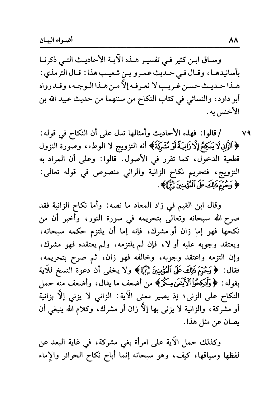 قالوا: فهذه الأحاديث وأمثالها تدل على أن النكاح في قوله: {الزَّانِي لَا يَنْكِحُ إِلَّا زَانِيَةً أَوْ مُشْرِكَةً} أنَّه التزويج لا الوطء، وصورة النزول قطعية الدخول، كما تقرر في الأصول. قالوا: وعلى أن المراد به التزويج، فتحريم نكاح الزانية والزاني منصوص في قوله تعالى: {وَحُرِّمَ ذَلِكَ عَلَى الْمُؤْمِنِينَ (٣)}.