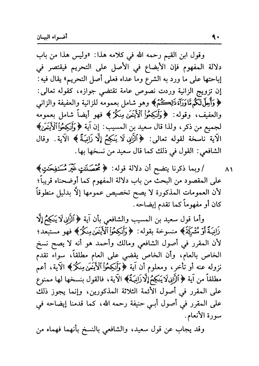 وقول ابن القيم رحمه الله في كلامه هذا: "وليس هذا من باب دلالة المفهوم فإن الأبضاع في الأصل على التحريم فيقتصر في إباحتها على ما ورد به الشرع وما عداه في أصل التحريم" يقال فيه: إن تزويج الزانية وردت نصوص عامة تقتضي جوازه، كقوله تعالى: {وَأُحِلَّ لَكمُ مَا وَرَاءِ ذَلِكُمْ} وهو شامل بعمومه للزانية والعفيفة والزاني والعفيف، وقوله: {وَأَنْكِحُوا الْأَيَامَى مِنْكُمْ} فهو أيضًا شامل بعمومه لجميع من ذكر، ولذا قال سعيد بن المسيب: إن آية {وَأَنْكِحُوا الْأَيَامَى} الآية ناسخة لقوله تعالى: {الزَّانِي لَا يَنْكِحُ إِلَّا زَانِيَةً أَوْ مُشْرِكَةً} الآية. وقال الشافعي: القول في ذلك كما قال سعيد من نسخها بها.