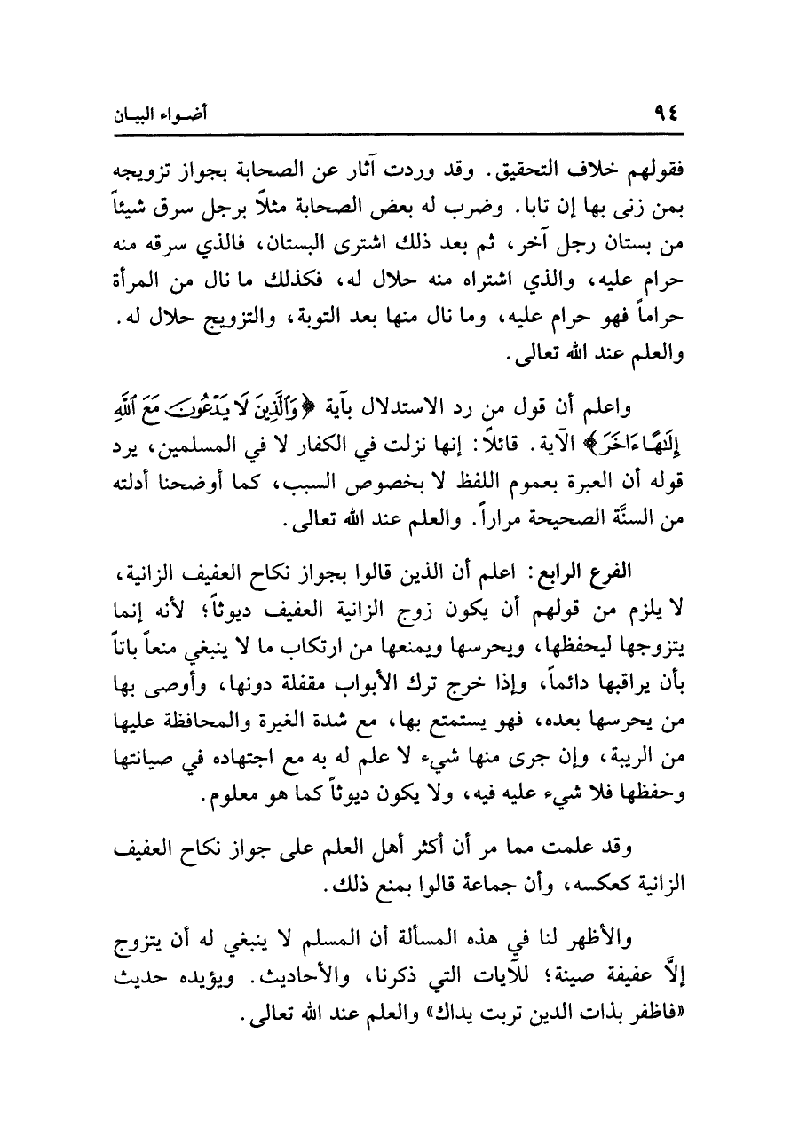 والأظهر لنا في هذه المسألة أن المسلم لا ينبغي له أن يتزوج إلَّا عفيفة صينة؛ للآيات التي ذكرنا، والأحاديث. ويؤيده حديث "فاظفر بذات الدين تربت يداك" والعلم عند الله تعالى.
