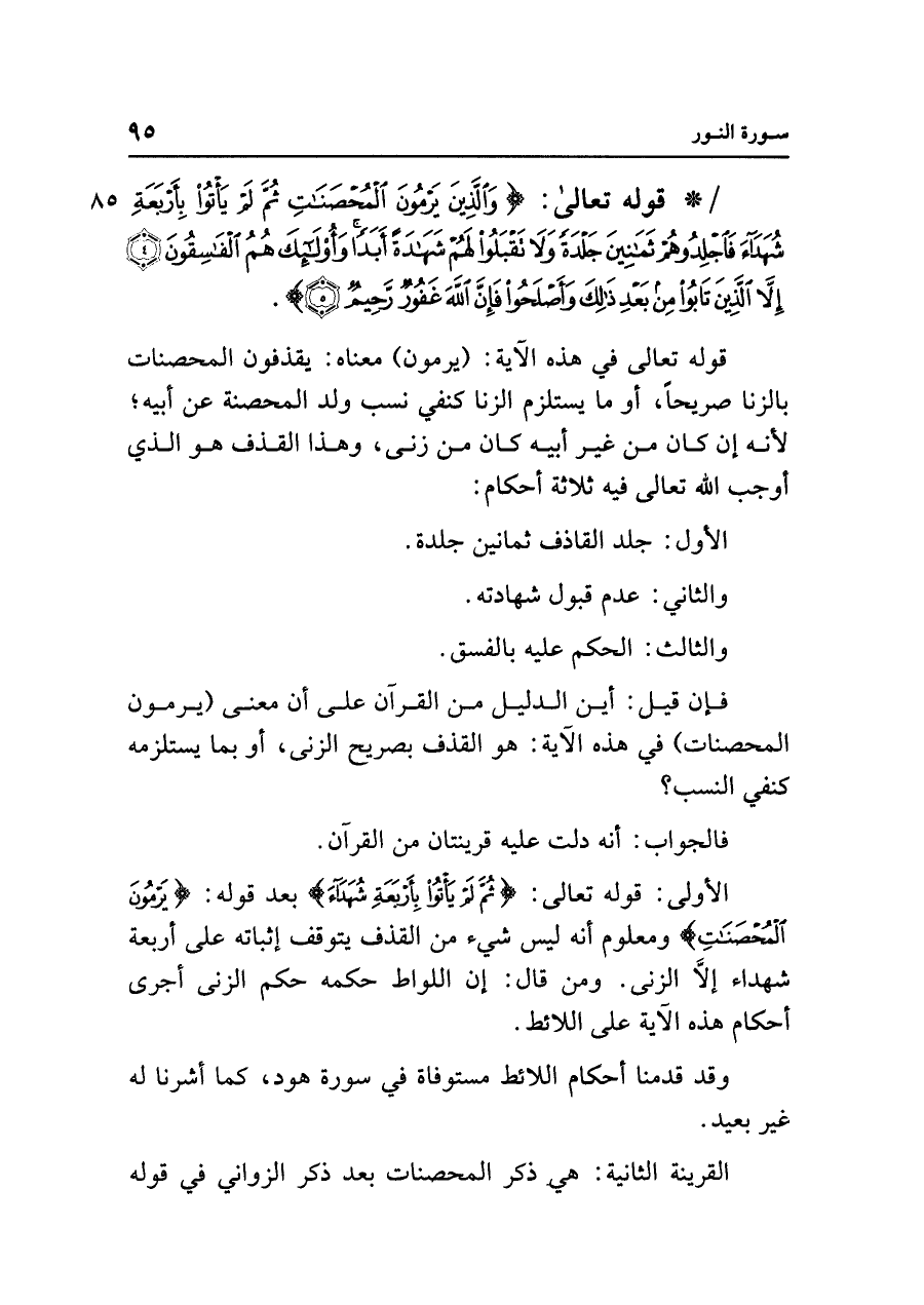 قوله تعالى في هذه الآية: (يرمون) معناه: يقذفون المحصنات بالزنا صريحًا، أو ما يستلزم الزنا كنفي نسب ولد المحصنة عن أبيه؛ لأنه إن كان من غير أبيه كان من زنى، وهذا القذف هو الذي أوجب الله تعالى فيه ثلاثة أحكام: