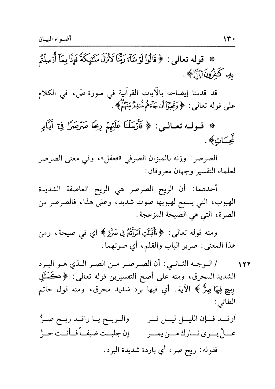الوجه الثاني: أن الصرصر من الصر الذي هو البرد الشديد المحرق، ومنه على أصح التفسيرين قوله تعالى: {كَمَثَلِ رِيحٍ فِيهَا صِرٌّ} الآية. أي فيها برد شديد محرق، ومنه قول حاتم الطائي:
