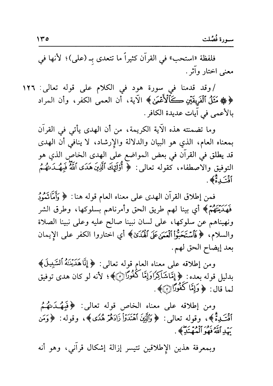 وما تضمنته هذه الآية الكريمة، من أن الهدى يأتي في القرآن بمعناه العام، الذي هو البيان والدلالة والإِرشاد، لا ينافي أن الهدى قد يطلق في القرآن في بعض المواضع على الهدى الخاص الذي هو التوفيق والاصطفاء، كقوله تعالى: {أُولَئِكَ الَّذِينَ هَدَى اللَّهُ فَبِهُدَاهُمُ اقْتَدِهْ}.