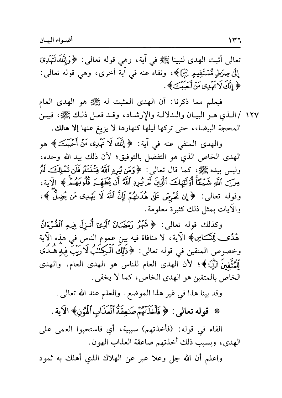فيعلم مما ذكرنا: أن الهدى المثبت له - صلى الله عليه وسلم - هو الهدى العام الذي هو البيان والدلالة والإِرشاد، وقد فعل ذلك - صلى الله عليه وسلم -، فبين المحجة البيضاء، حتى تركها ليلها كنهارها لا يزيغ عنها هالك.
