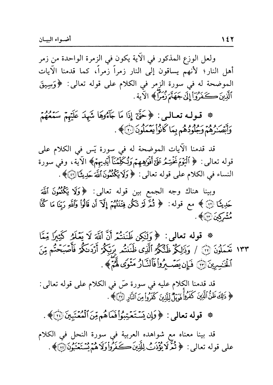 قد قدمنا الآيات الموضحة له في سورة يس في الكلام على قوله تعالى: {الْيَوْمَ نَخْتِمُ عَلَى أَفْوَاهِهِمْ وَتُكَلِّمُنَا أَيْدِيهِمْ} الآية، وفي سورة النساء في الكلام على قوله تعالى: {وَلَا يَكْتُمُونَ اللَّهَ حَدِيثًا (٤٢)}.