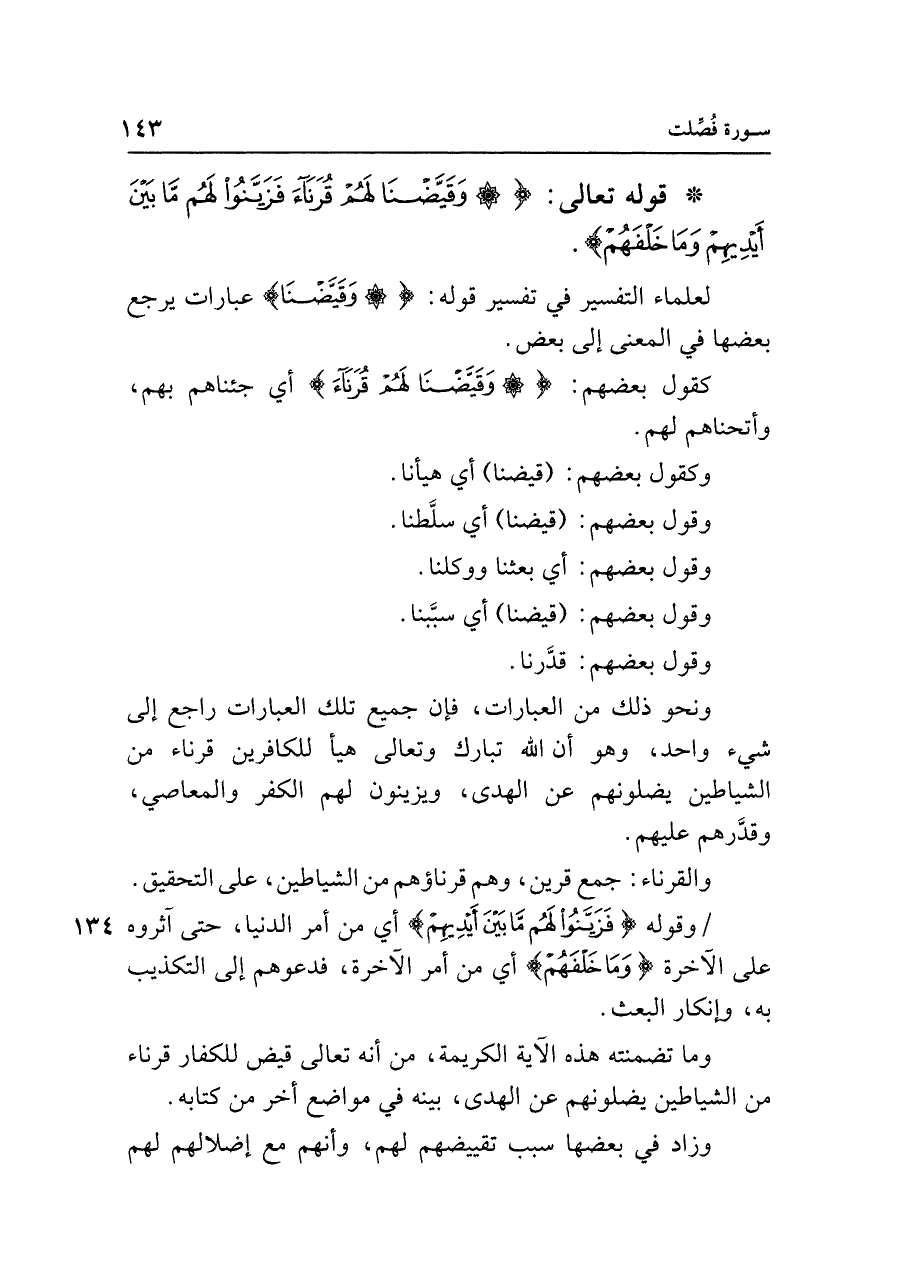 ونحو ذلك من العبارات، فإن جميع تلك العبارات راجع إلى شيء واحد، وهو أن الله تبارك وتعالى هيأ للكافرين قرناء من الشياطين يضلونهم عن الهدى، ويزينون لهم الكفر والمعاصي، وقدَّرهم عليهم.