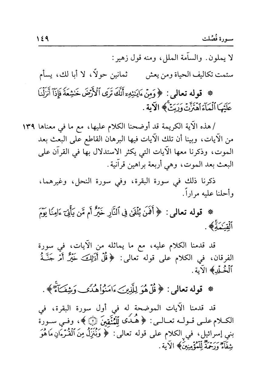 قد قدمنا الآيات الموضحة له في أول سورة البقرة، في الكلام على قوله تعالى: {هُدًى لِلْمُتَّقِينَ (٢)}، وفي سورة بني إسرائيل، في الكلام على قوله تعالى: {وَنُنَزِّلُ مِنَ الْقُرْآنِ مَا هُوَ شِفَاءٌ وَرَحْمَةٌ لِلْمُؤْمِنِينَ} الآية.